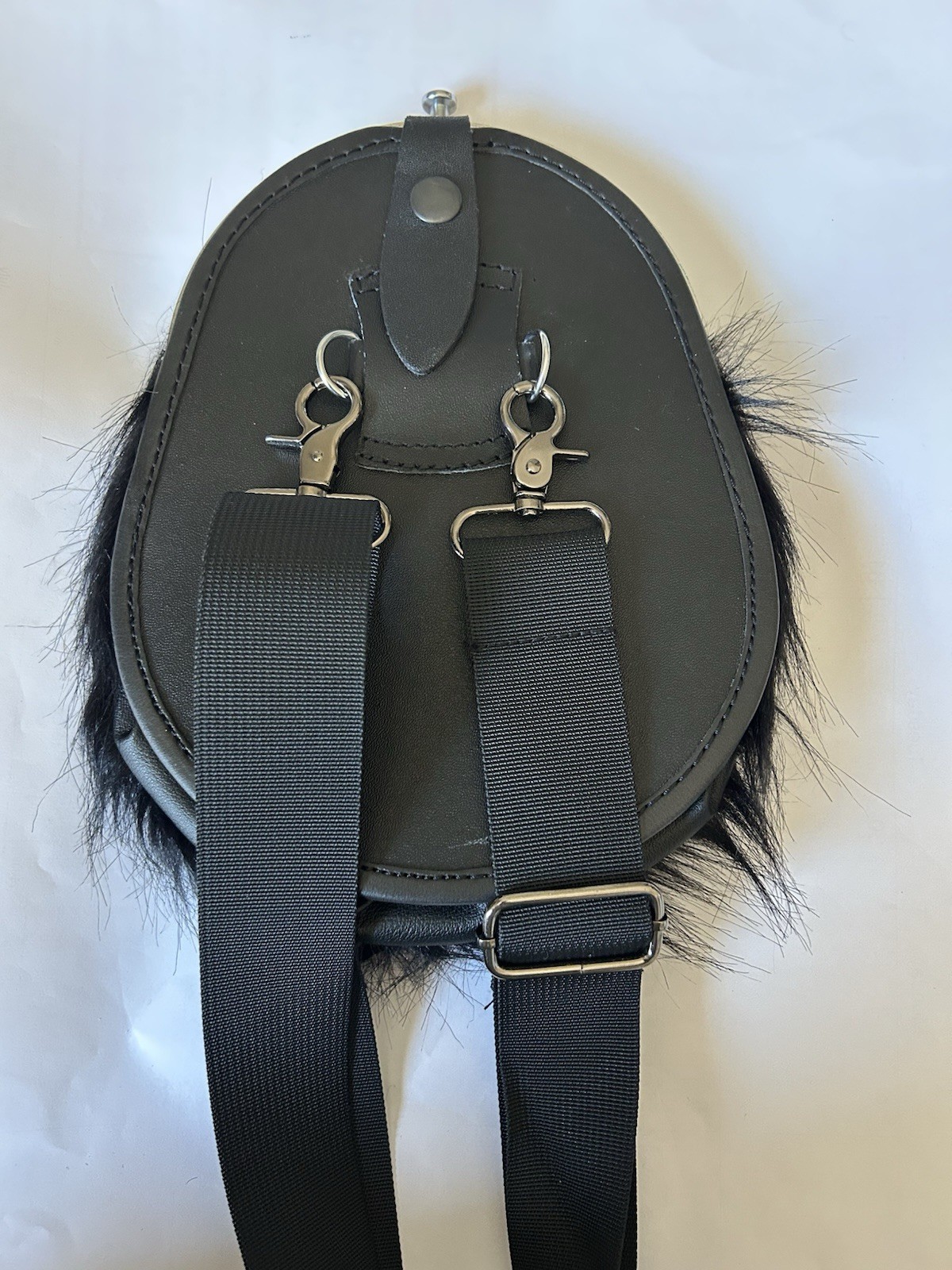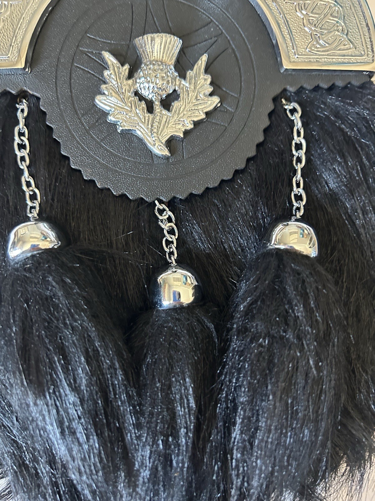 Scottish Black Fur Sporran: Thistle Badge, 3 White Tassels