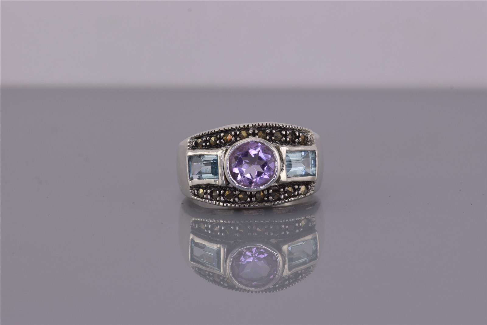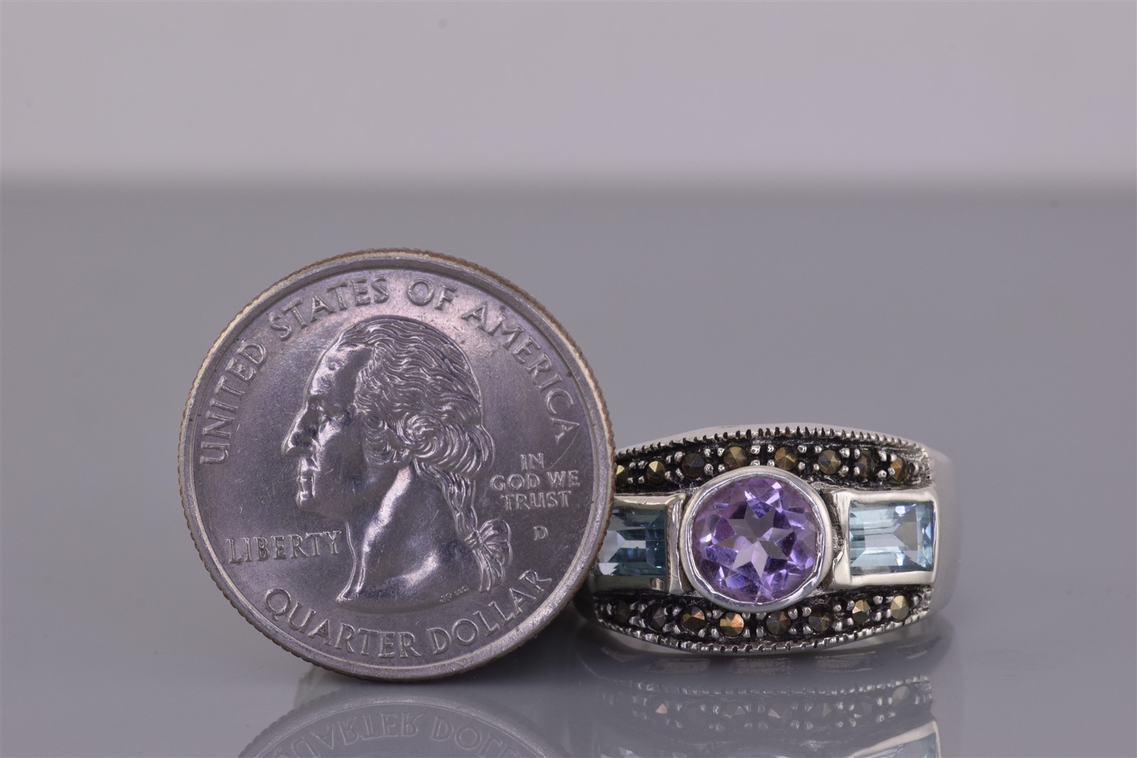 как выглядит Sterling Silver Purple Amethyst Blue Topaz Marcasite Accent Band Ring 925 Sz: 8 фото