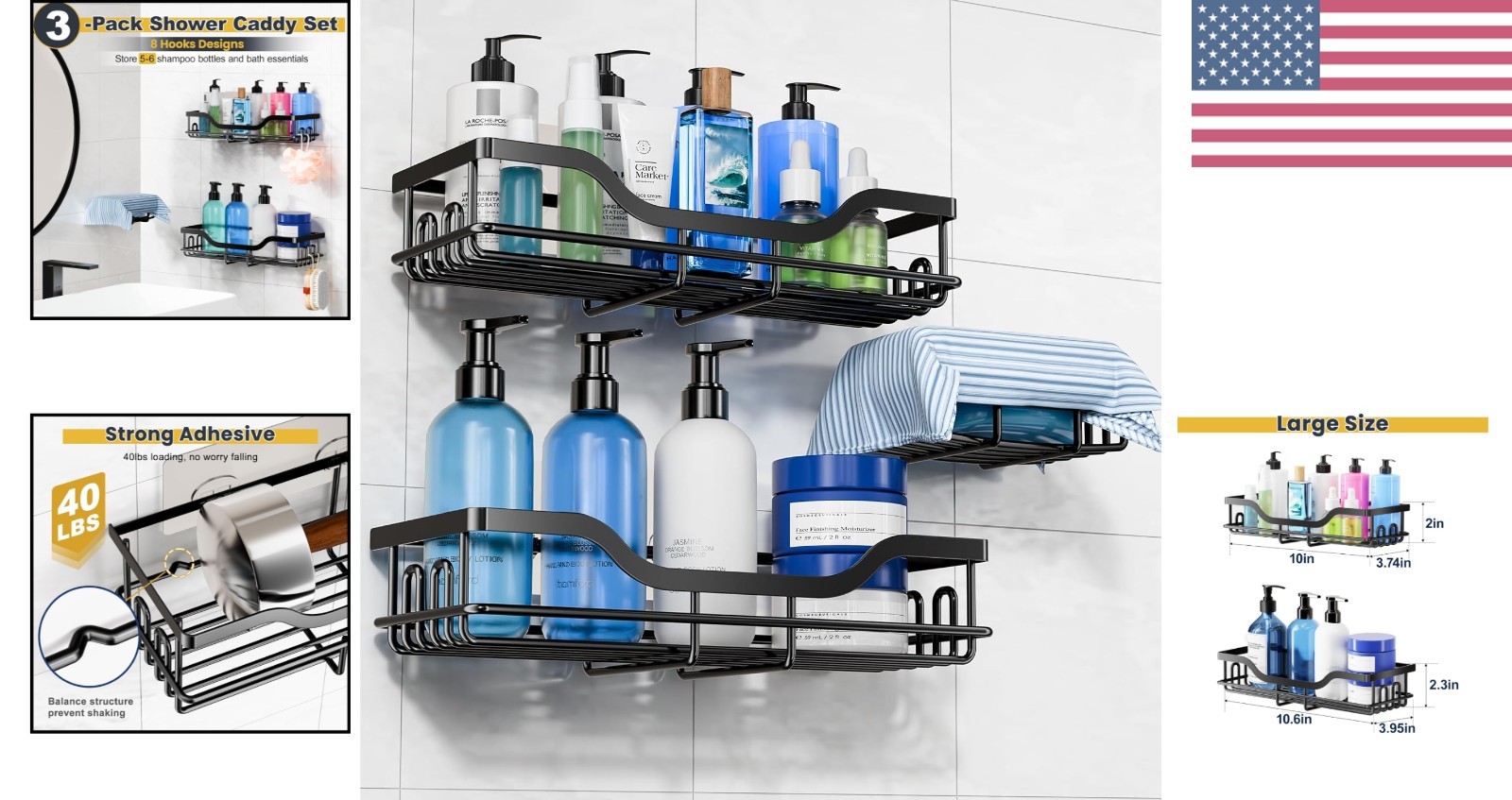 No-Drill 3-Pack Shower Organizer with Soap Holder - Durable Stylish Black