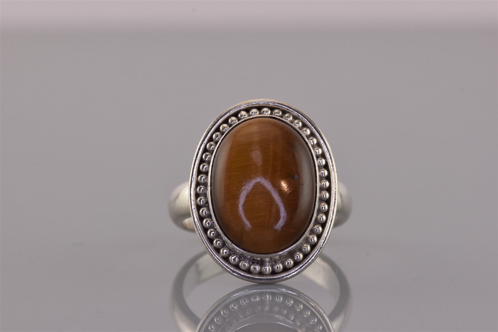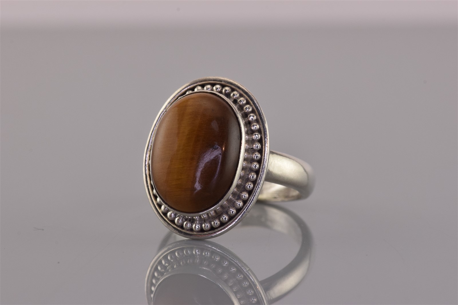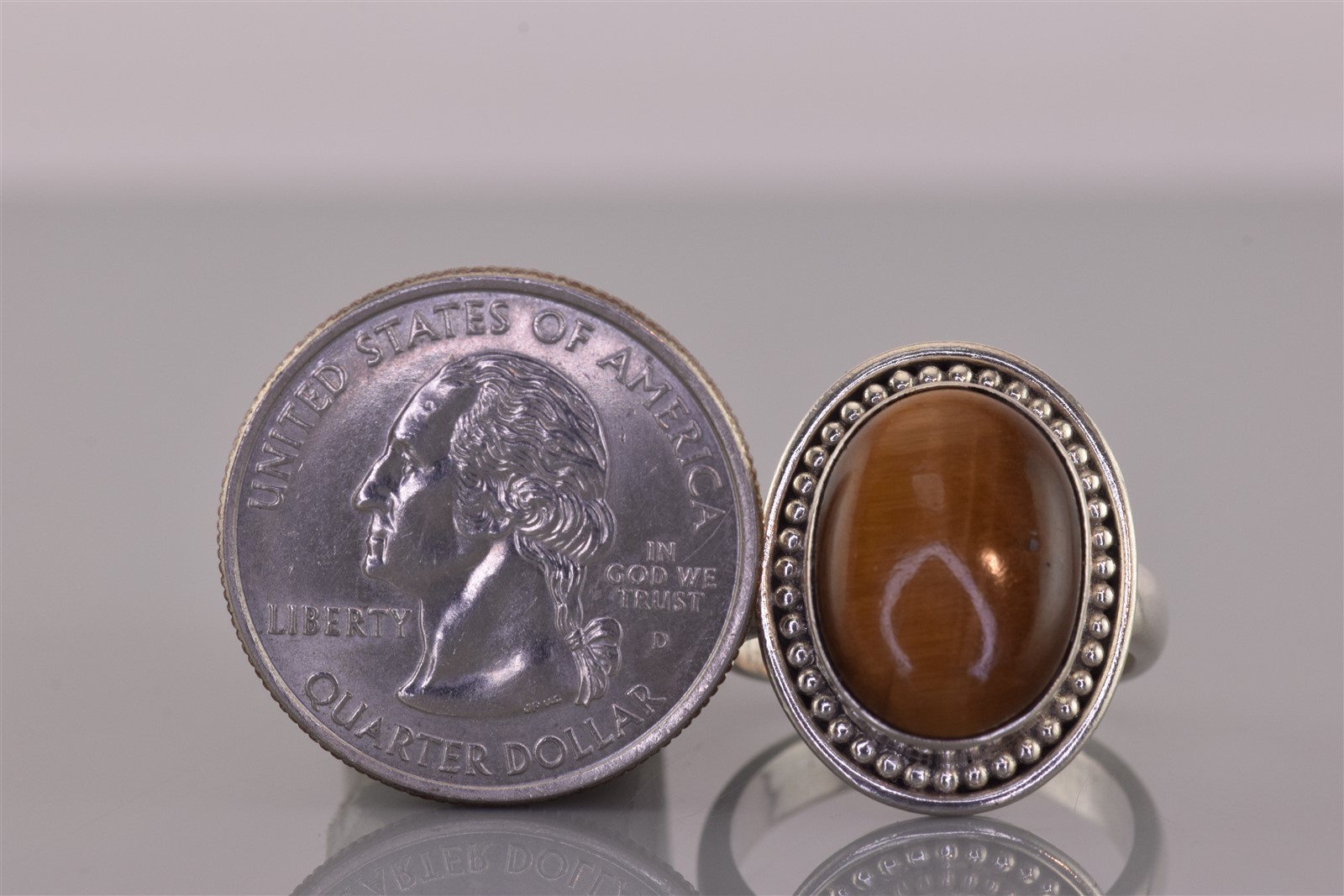 как выглядит Sterling Silver Dotted Bezel Tigers Eye Cabochon Statement Band Ring 925 Sz: 8 фото