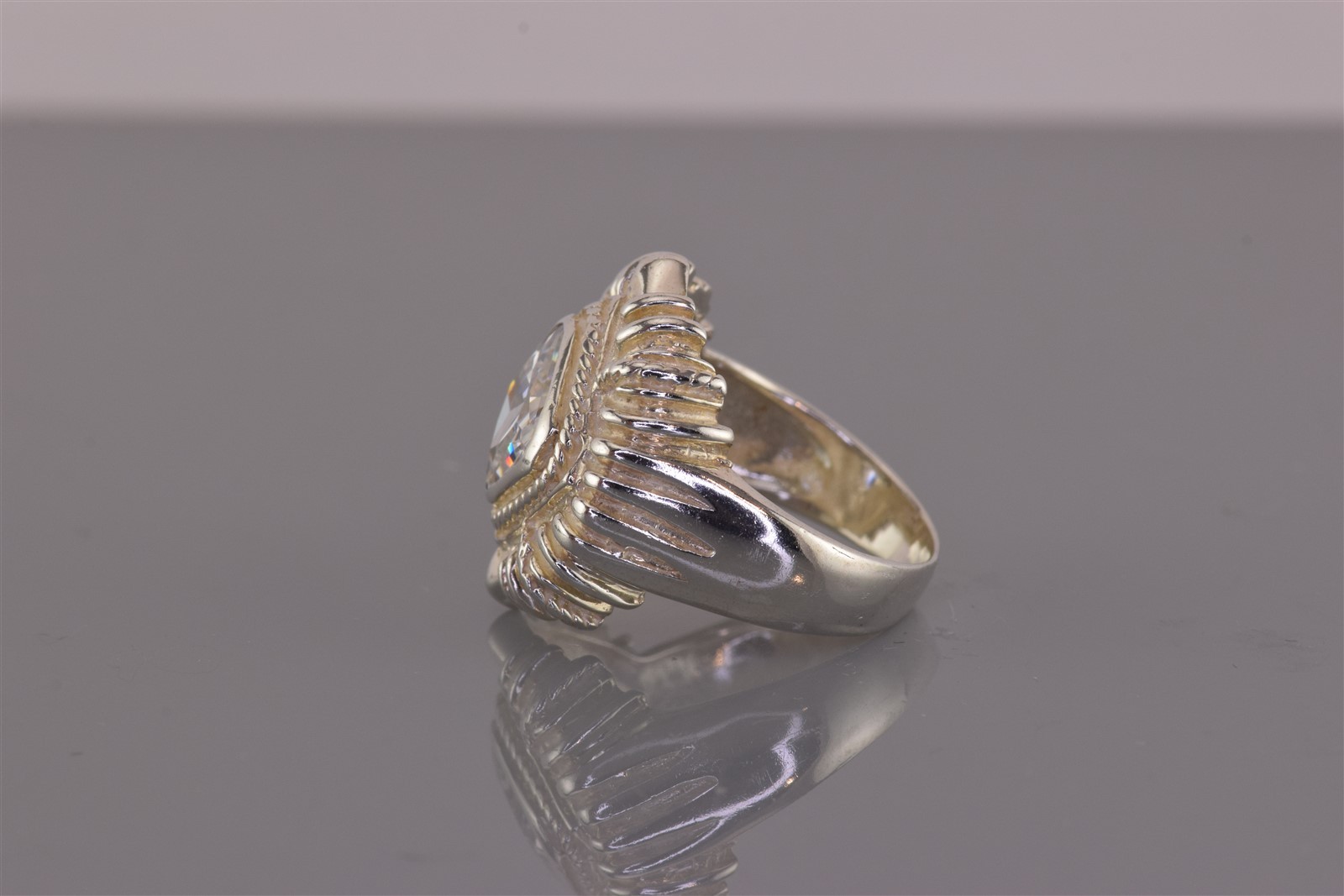как выглядит Sterling Silver Cushion Cut Cubic Zirconia Flared Ribbed Band Ring 925 Sz: 7 фото