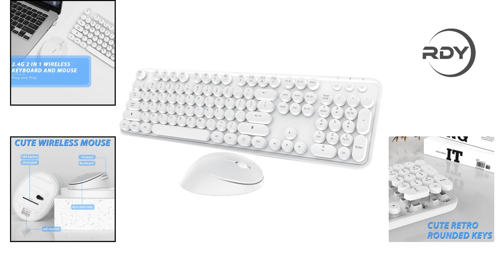 Cute White Wireless Keyboard Mouse Combo: Retro Round Keys Long Battery Life