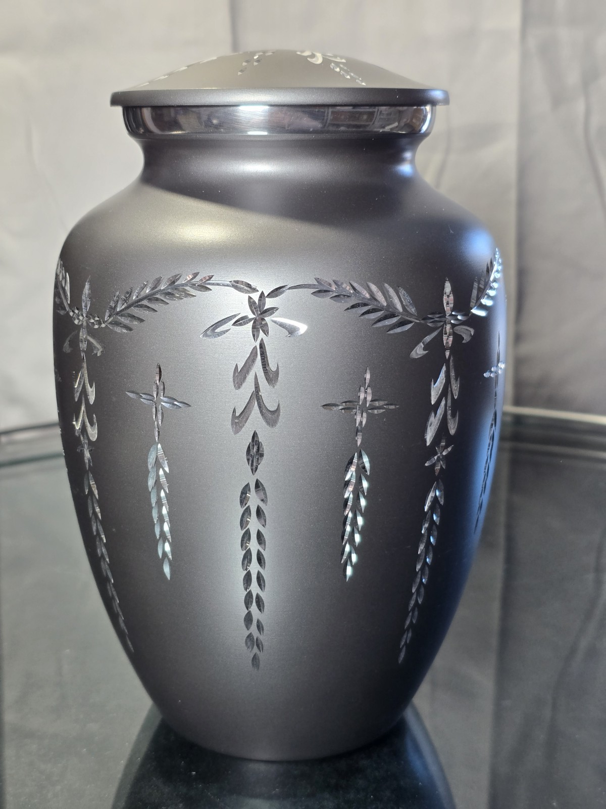 • NEW Medium Fancy Flourish Cremation Urn FOR HUMAN AHES 8 1/2 GREY METAL