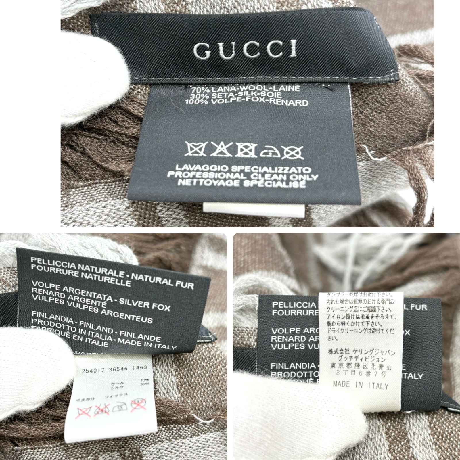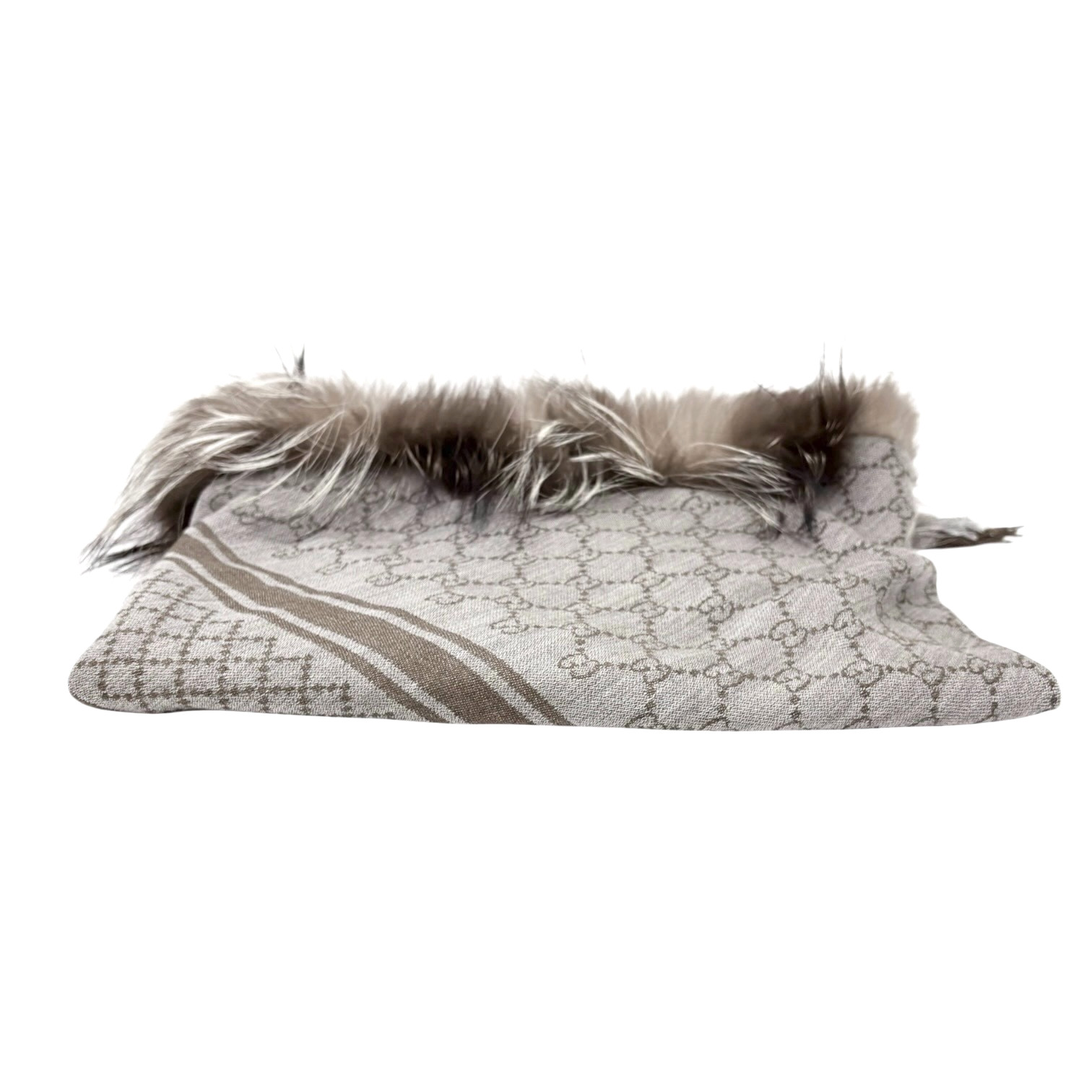 GUCCI Vintage GG Logo Monogram Fox Fur Shawl Scarf Wrap Gray Brown Wool