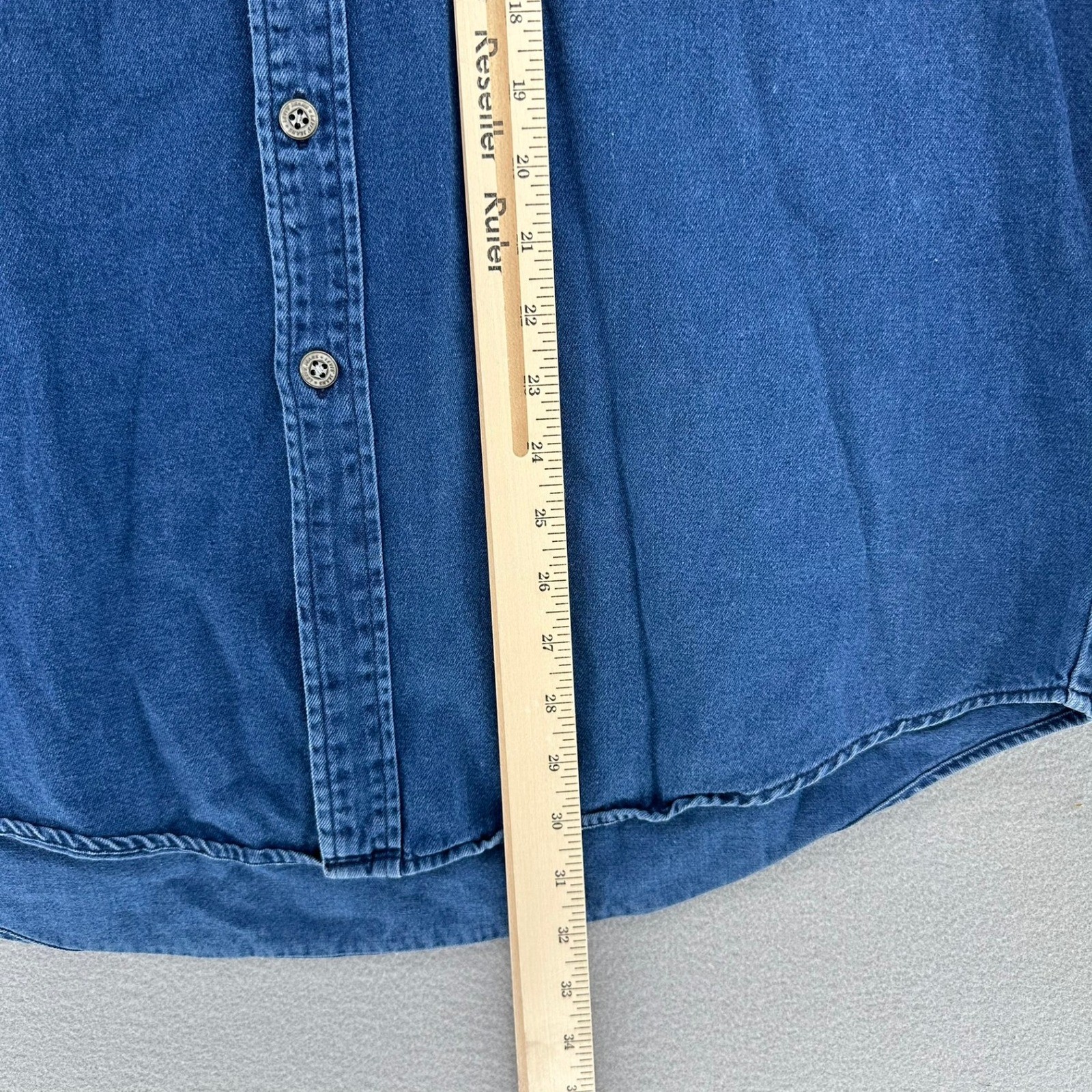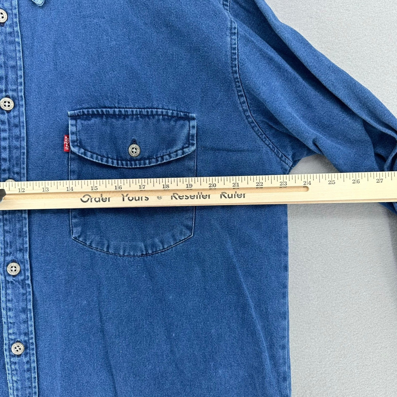 как выглядит VTG Levis Red Tab Mens Denim Button Up Shirt Long Sleeve Blue SZ L Distressed фото