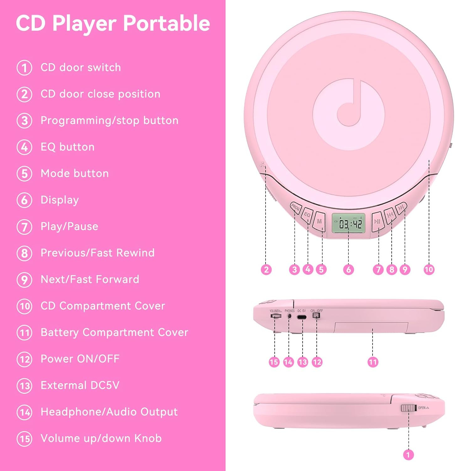 Portable CD Player with Earphones,Cd Discman for Car Home with Anti-Skip Shockpr