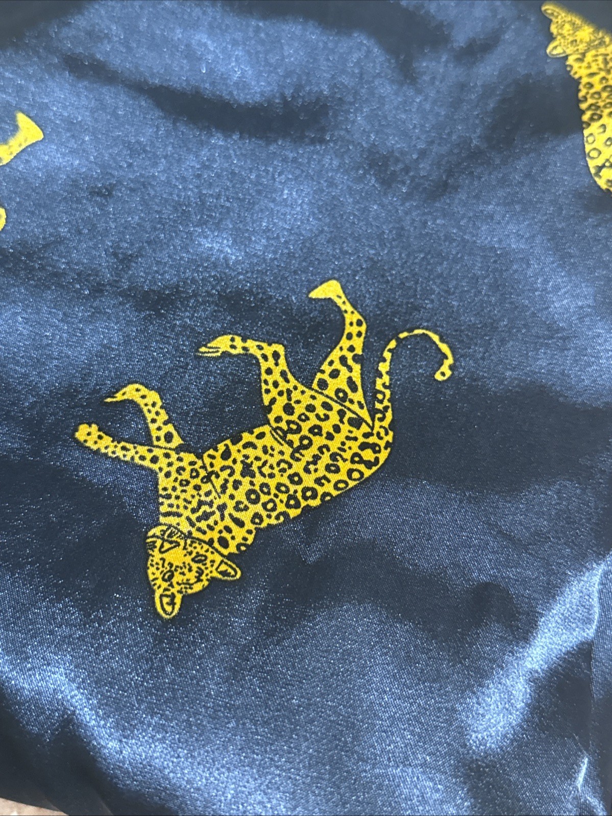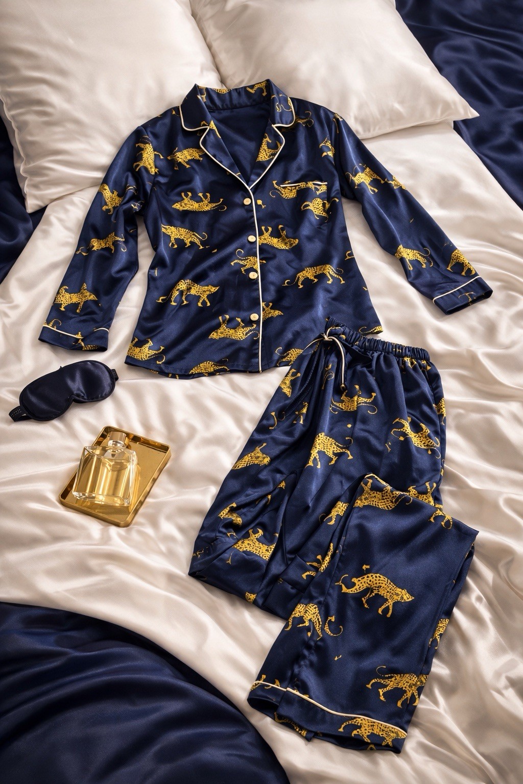 Silky Satin Leopard Print Pajama Set Women s Small Navy Gold Button Lounge