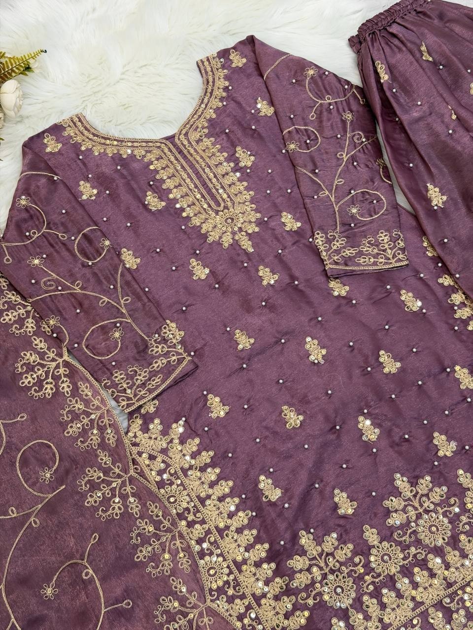 как выглядит Latest New Dusty Pink Pure Silk Top Palazzo With Dupatta For Functional Wear фото