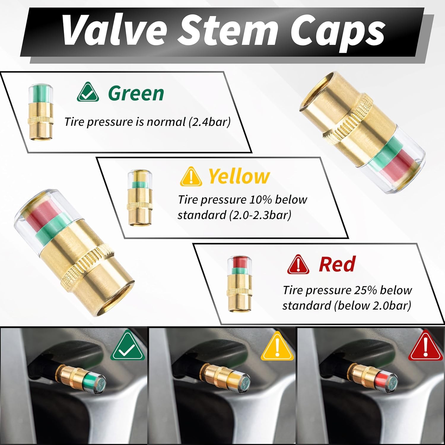 • 4 PCS Tire Pressure Caps, Tire Pressure Monitor Valve Stem Caps, 3 Colors Alarm