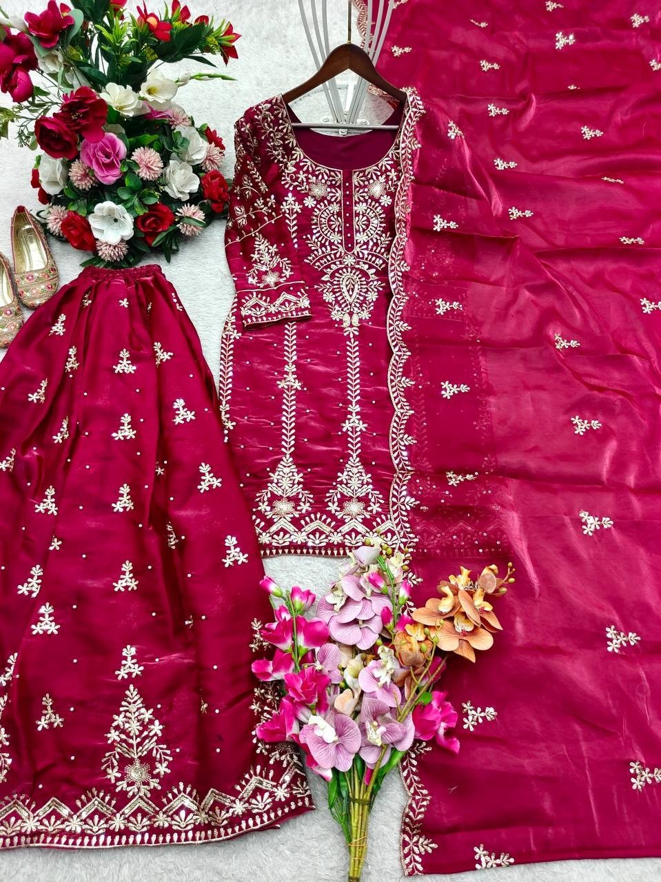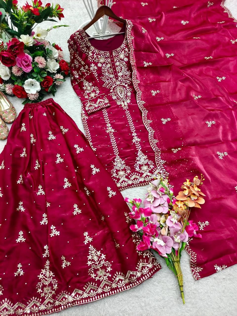 как выглядит Latest New Silk Pink Top Palazzo With Dupatta For Indian Party Wear фото