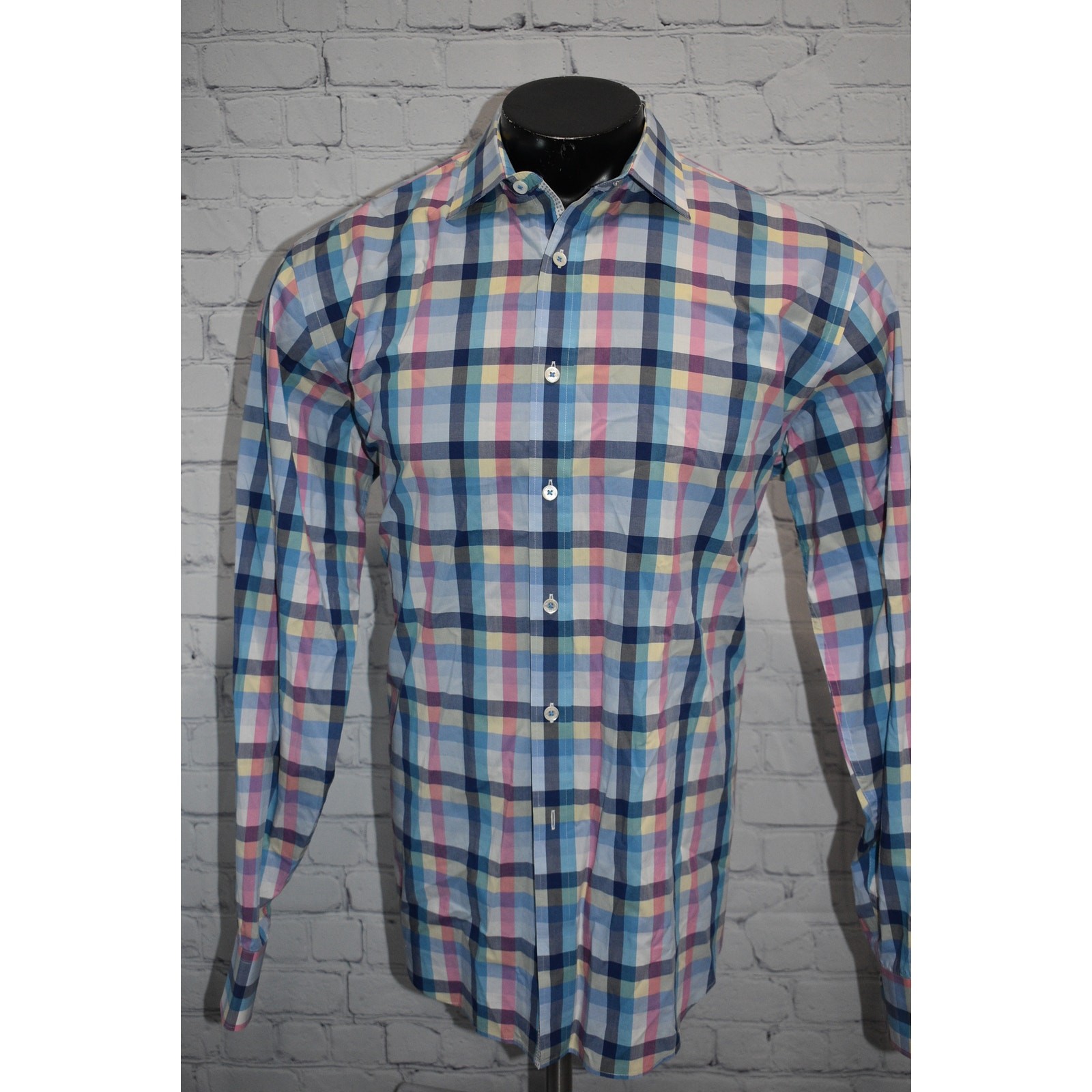 Bugatchi Uomo Dress Shirt Mens Size XL Blue Pink Plaid Designs Flip Cuffs