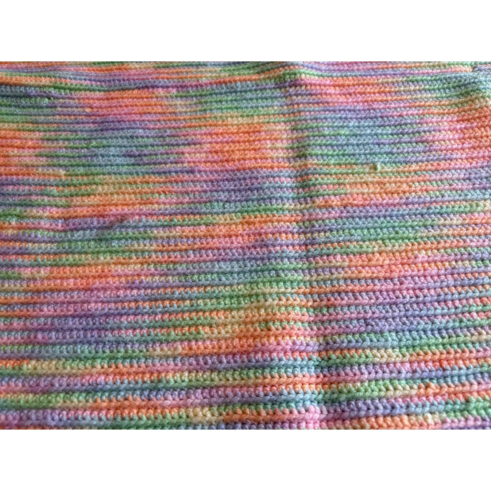 как выглядит Handmade crocheted baby blanket featuring a pastel multicolored yarnAppx 29x29 фото