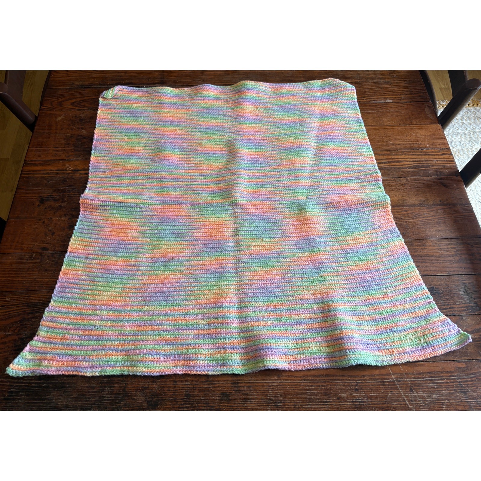 Handmade crocheted baby blanket featuring a pastel multicolored yarnAppx 29x29