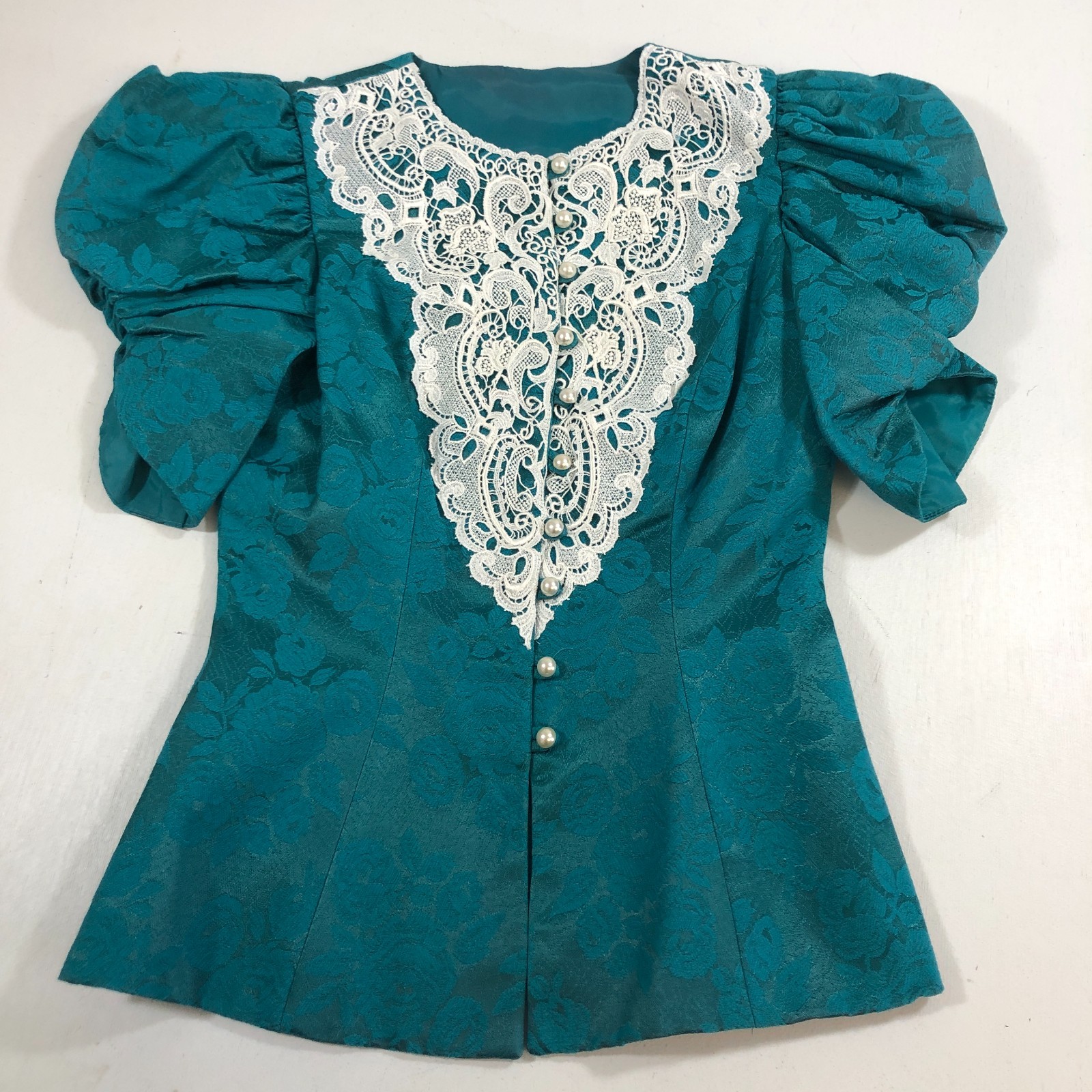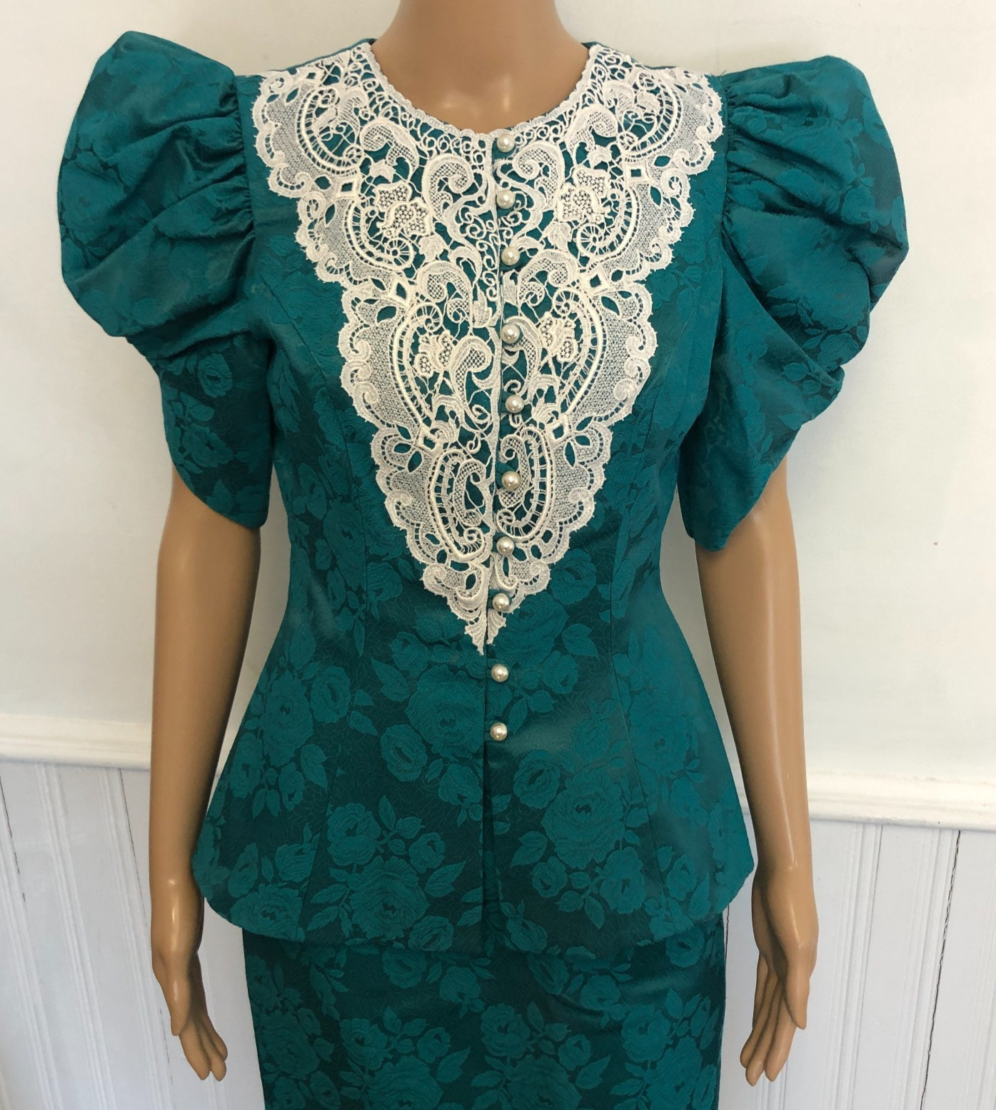 Womens vtg 80s Brocade Skirt Set Sz 6 Puff Sleeves Pearls Lace Pencil Skirt EUC