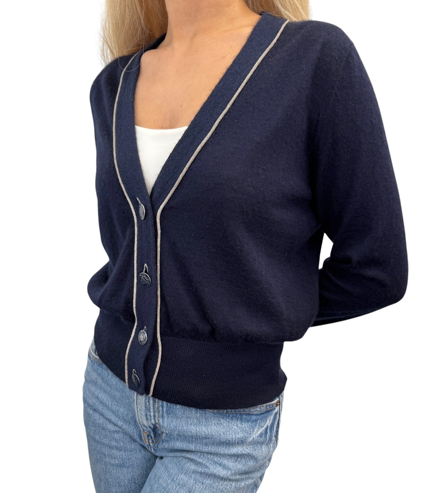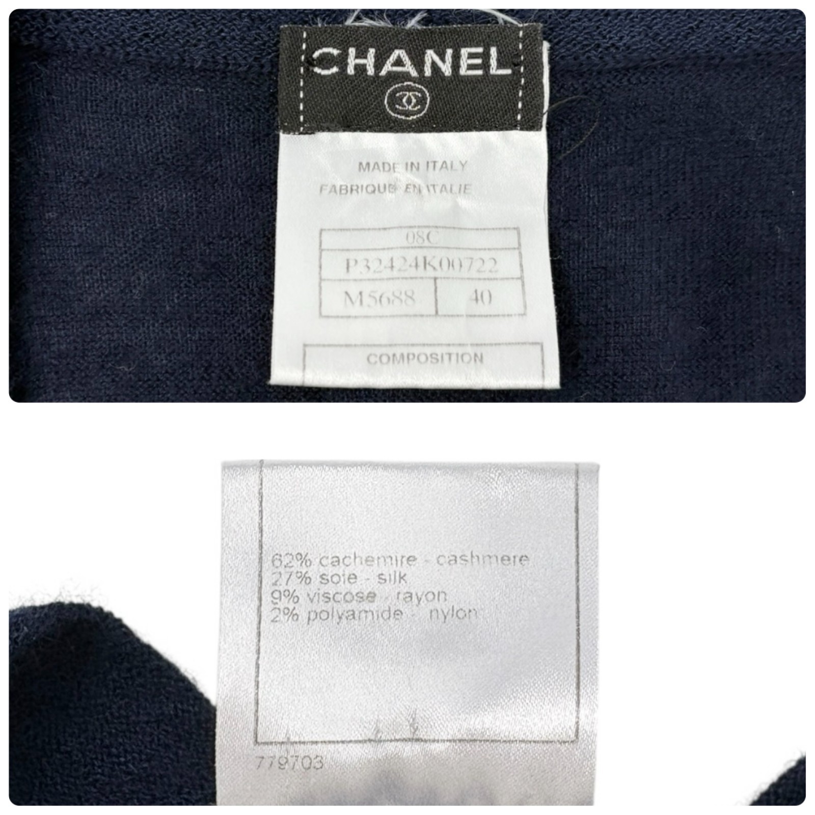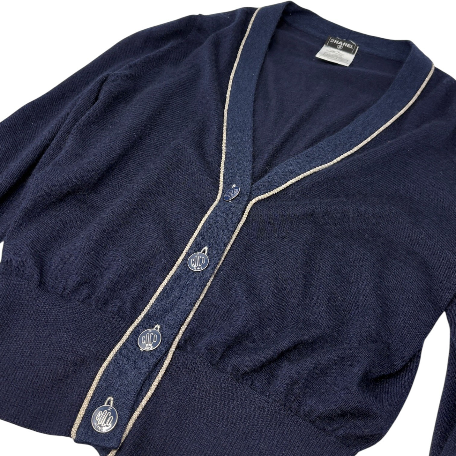 как выглядит CHANEL Vintage 08C CC Line Button Cashmere Cardigan Knit Top 40 Blue Silver фото