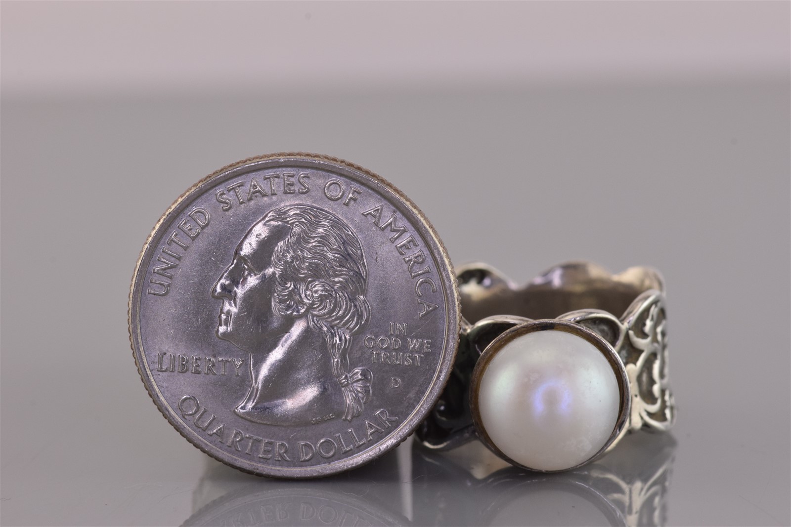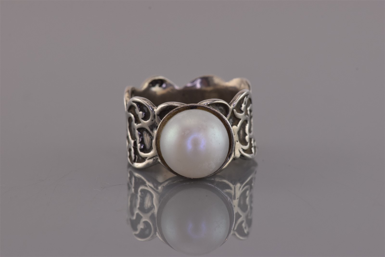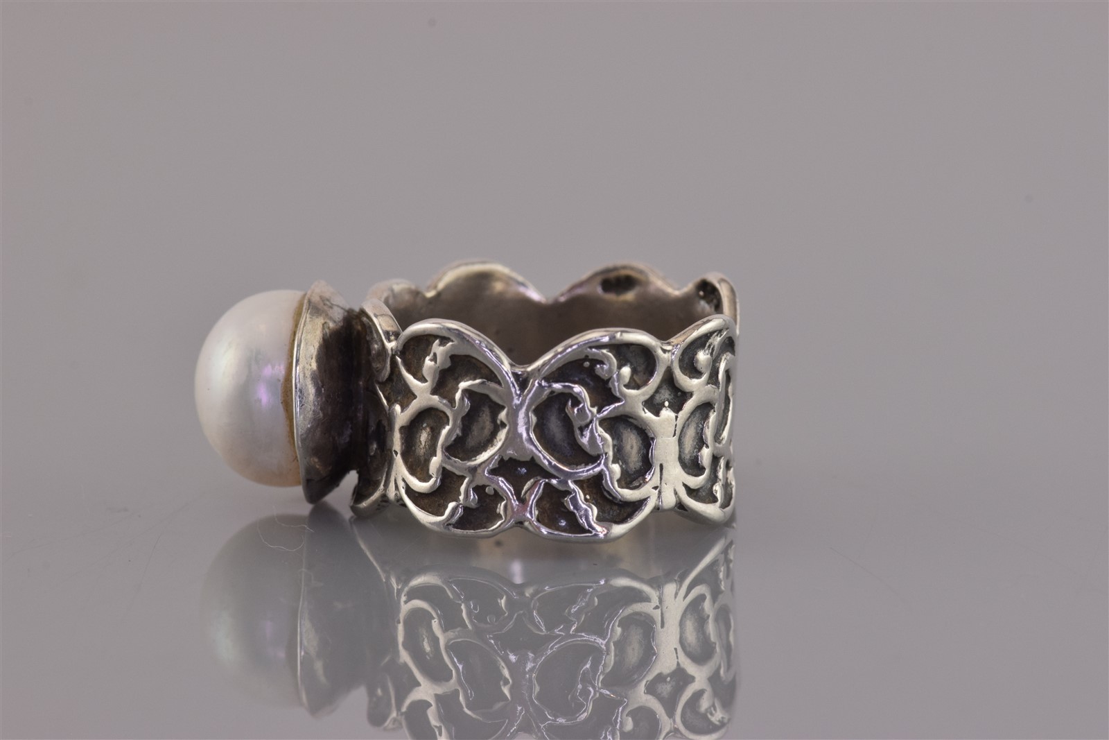 как выглядит Sterling Silver White Pearl Carved Oxidized Scalloped Band Ring 925 Sz: 7 фото