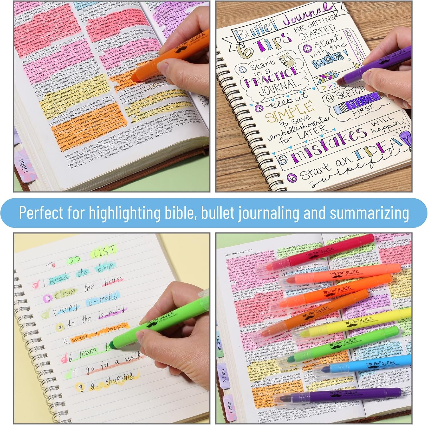 No Bleed Gel Bible Highlighters, Assorted Colors, Smear Free Ink, Pack of 8