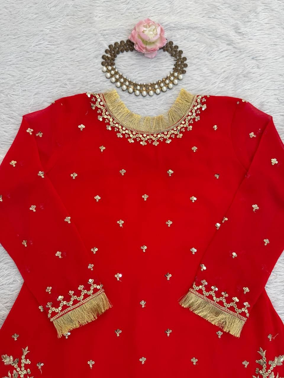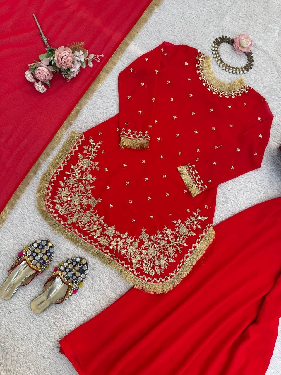 как выглядит Attractive Faux Georgette Red Top Palazzo With Dupatta For Functional Wear фото