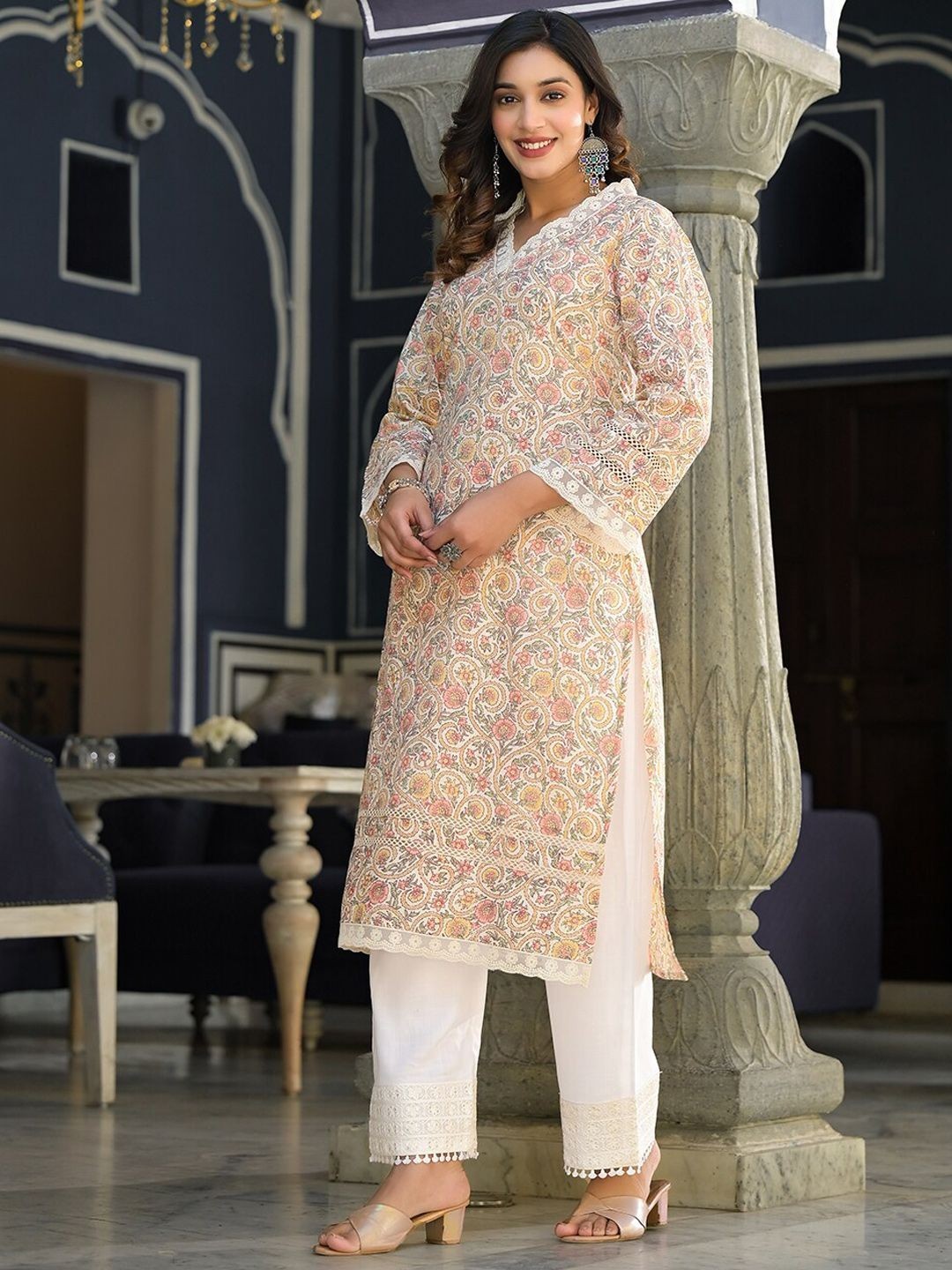 как выглядит Indian Women BEAUTIFUL Off White COTTON Floral Print Kurta Kurti Top Tunic Dress фото