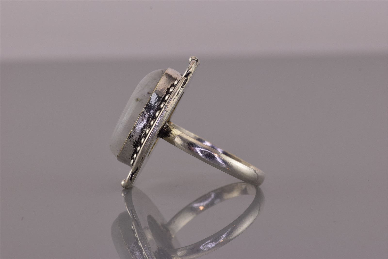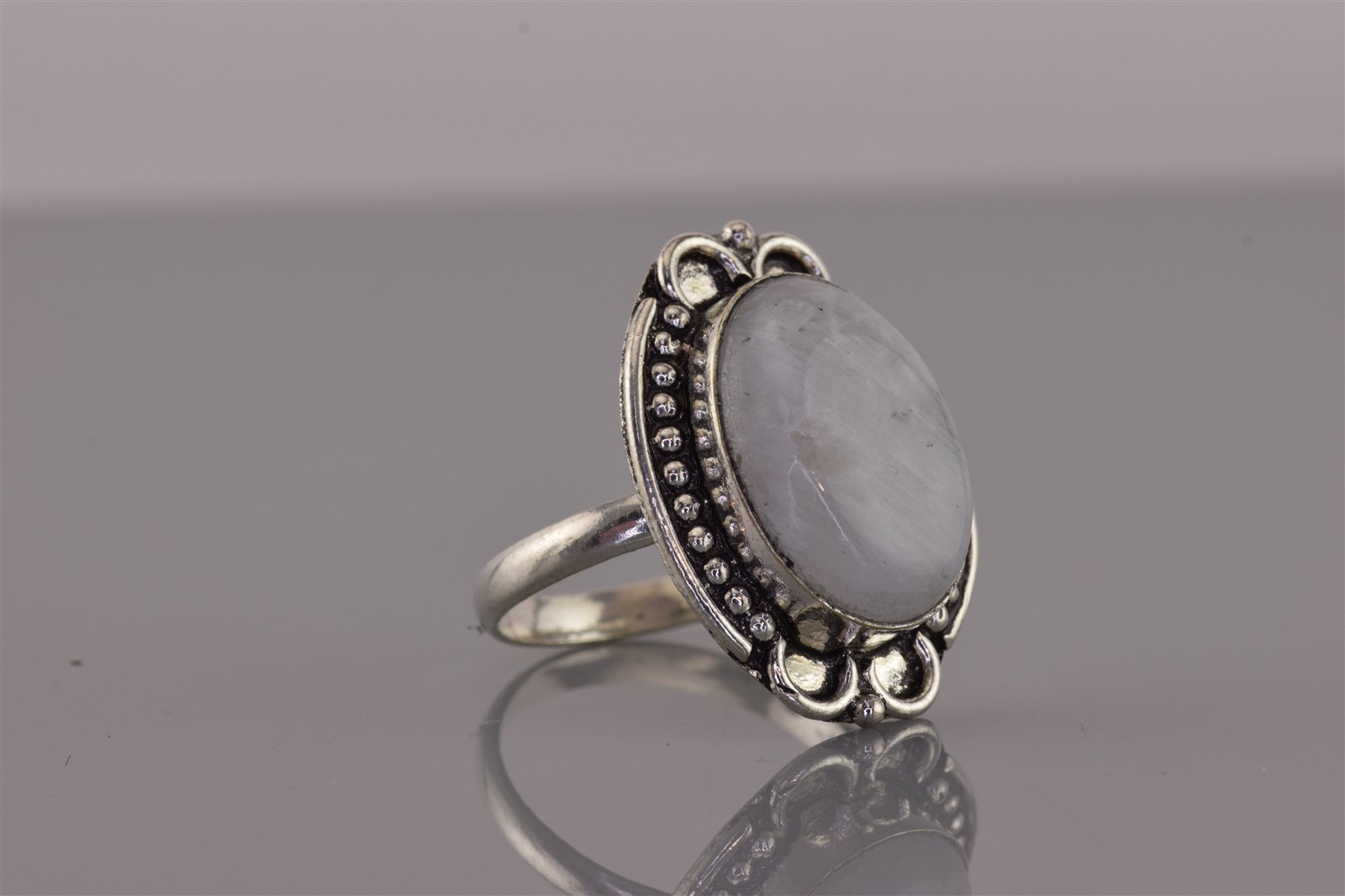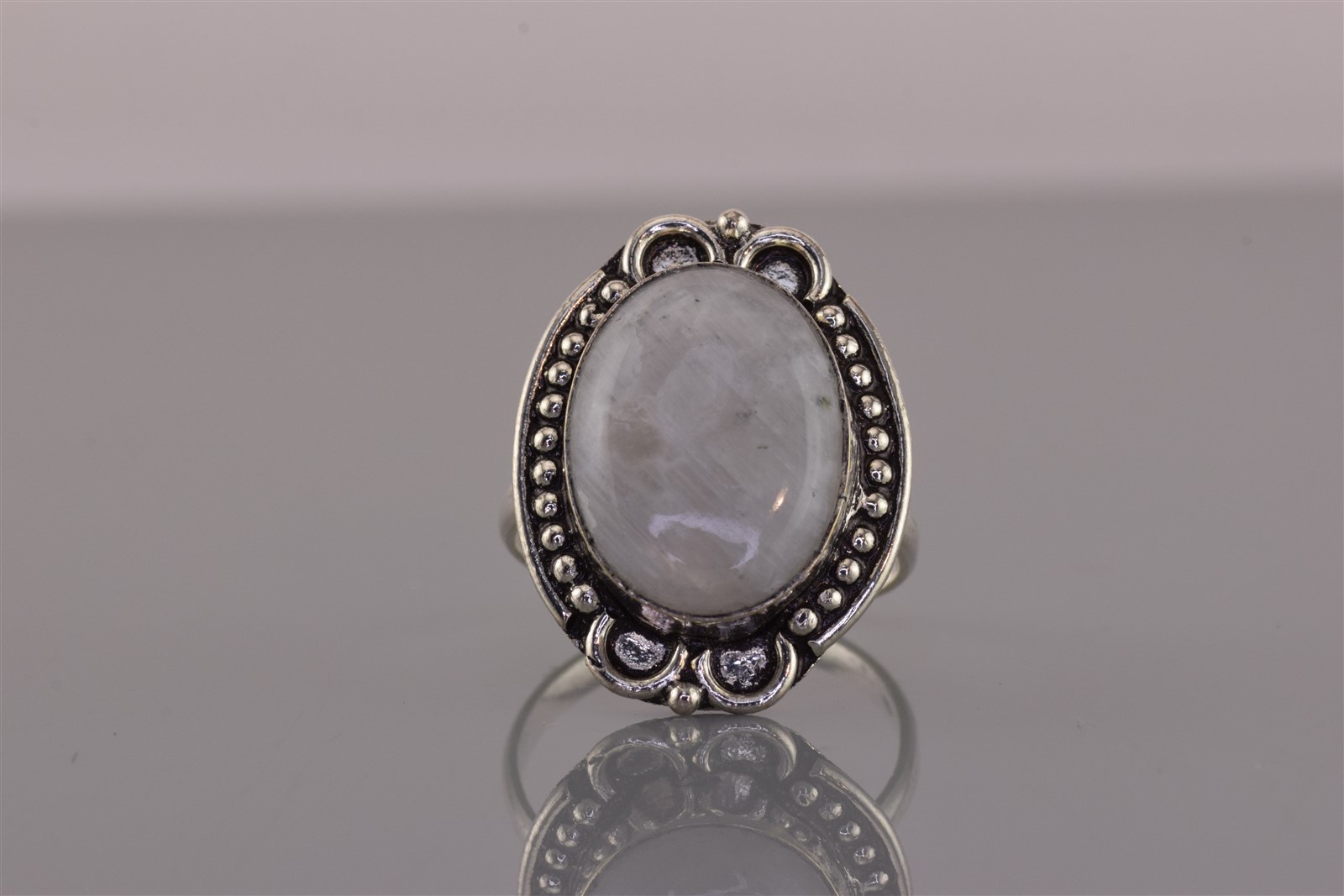 как выглядит Sterling Silver Dotted Trim Oval Rainbow Moonstone Band Ring 925 Sz: 9 фото