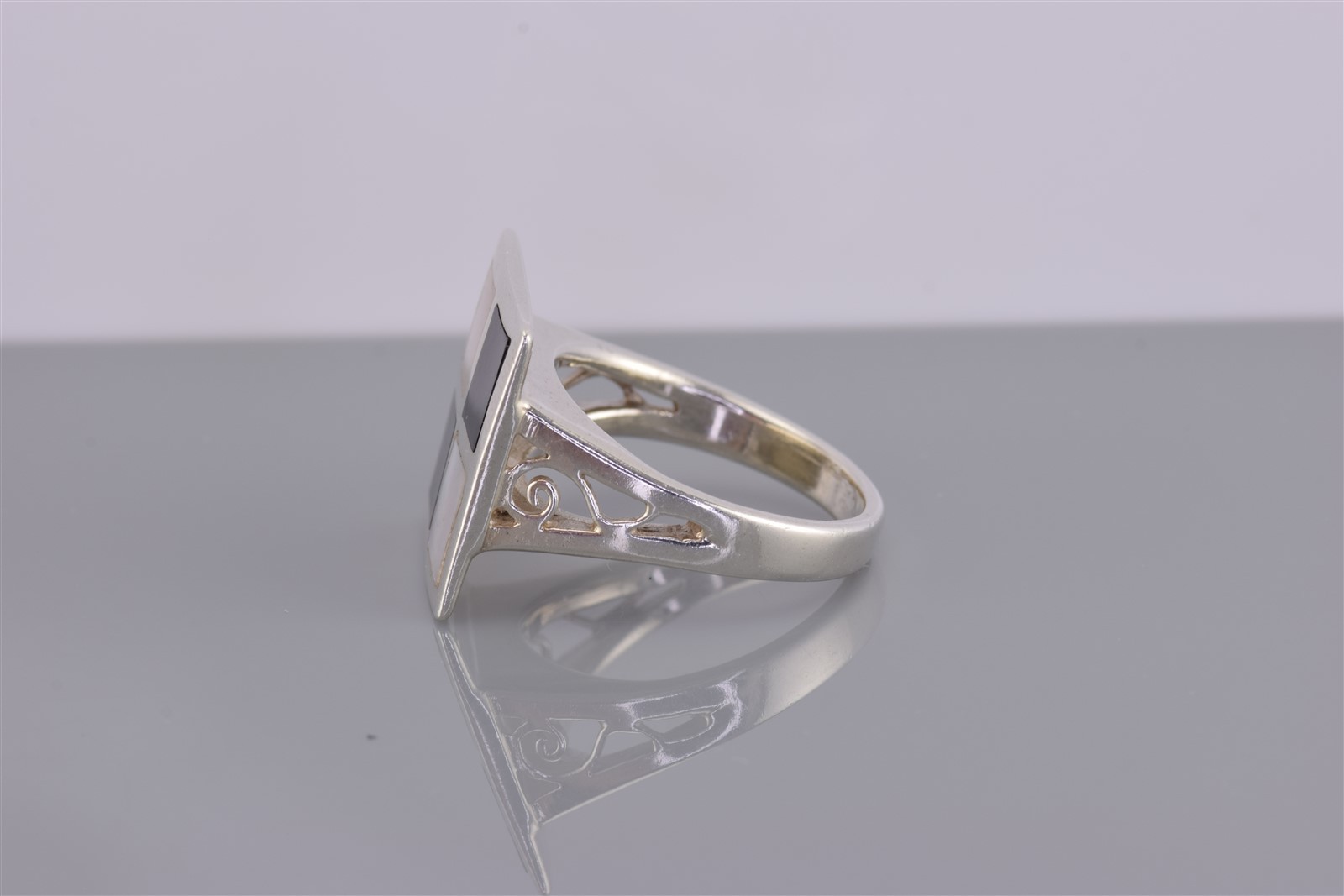 как выглядит Sterling Silver Framed Mother of Pearl Black Onyx Scrolled Band Ring 925 Sz: 8 фото