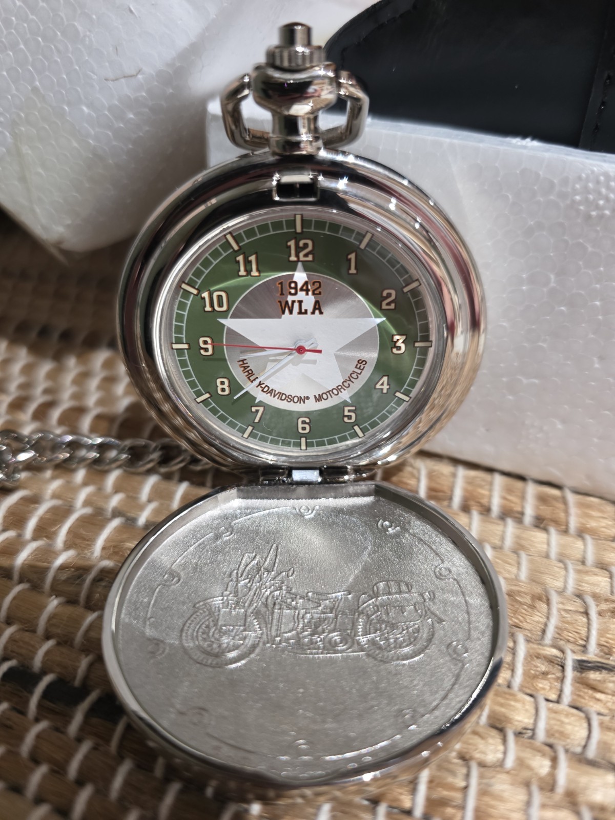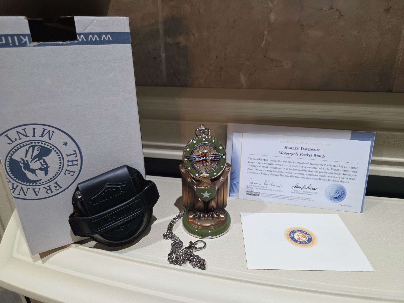 • Harley Davidson 1942 WLA Military Pocket Watch Franklin Mint with Stand and Case