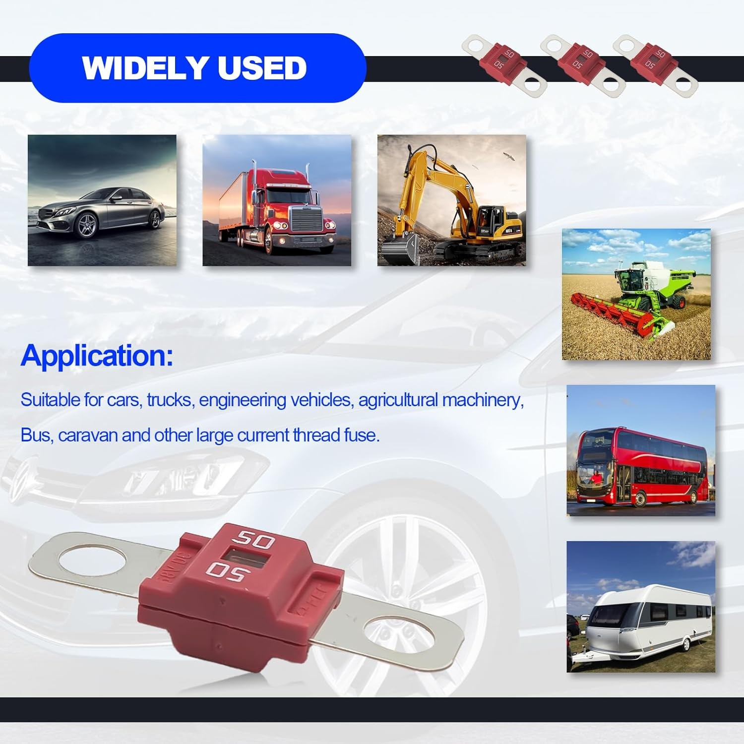 3PCS Midi Fuse, High Current 50A, for Cars, Buses, Trucks, Caravans, Constructio