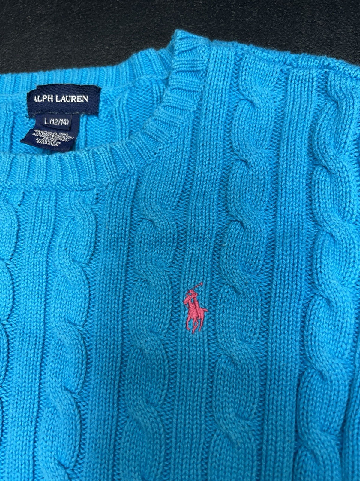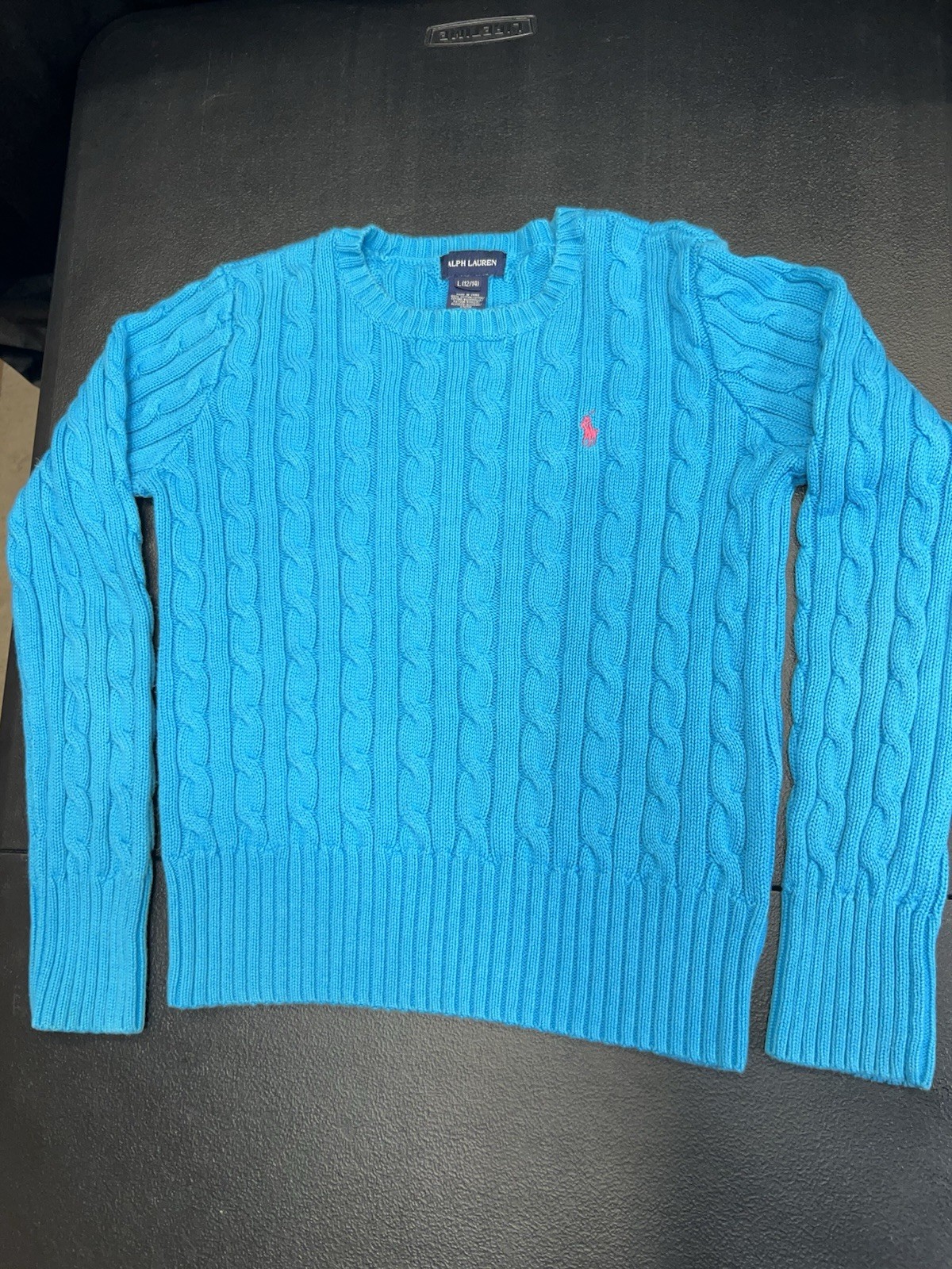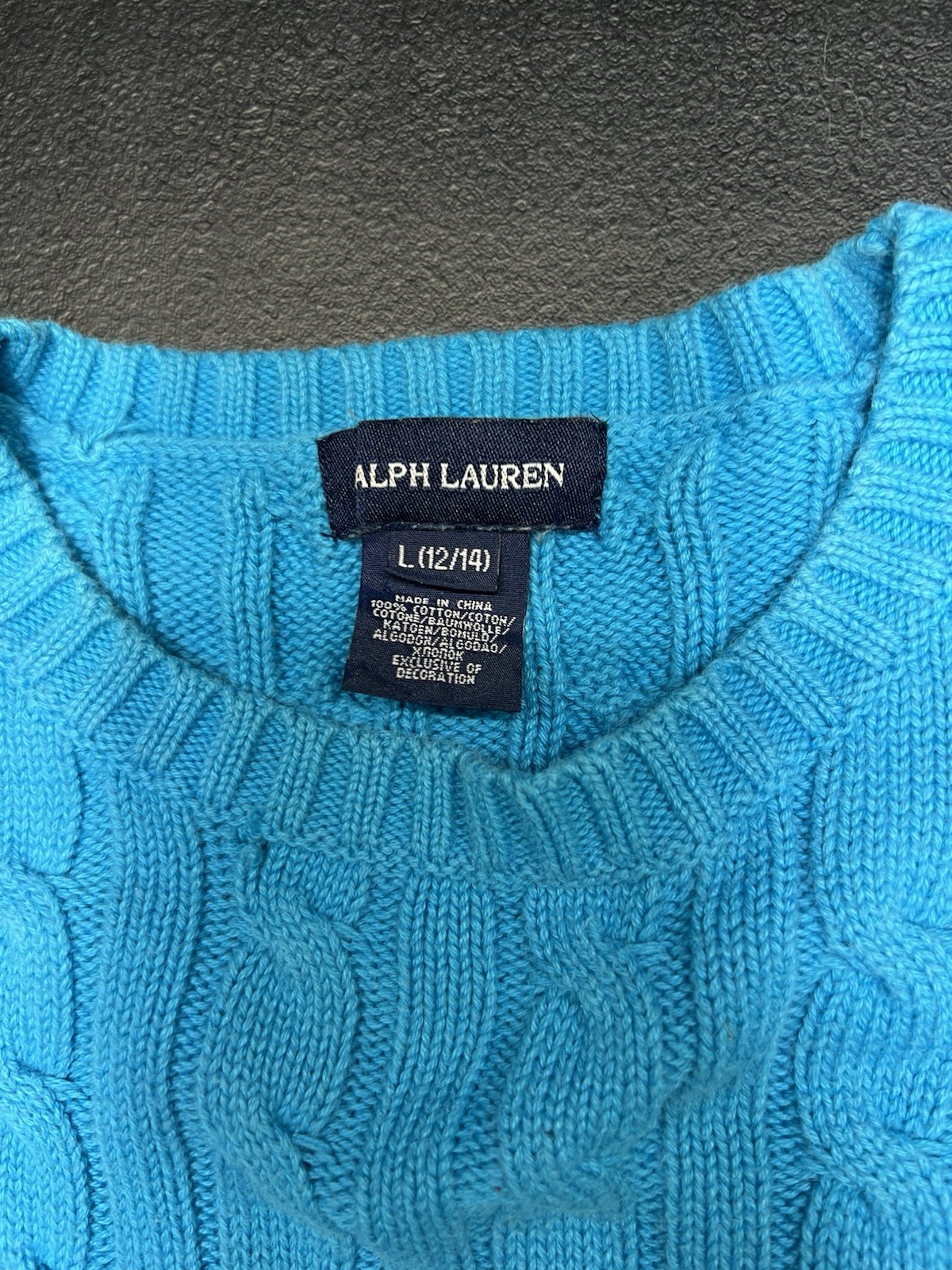 Ralph Lauren Cable Knit Sweater Blue Cotton Crewneck Girls L 12/14