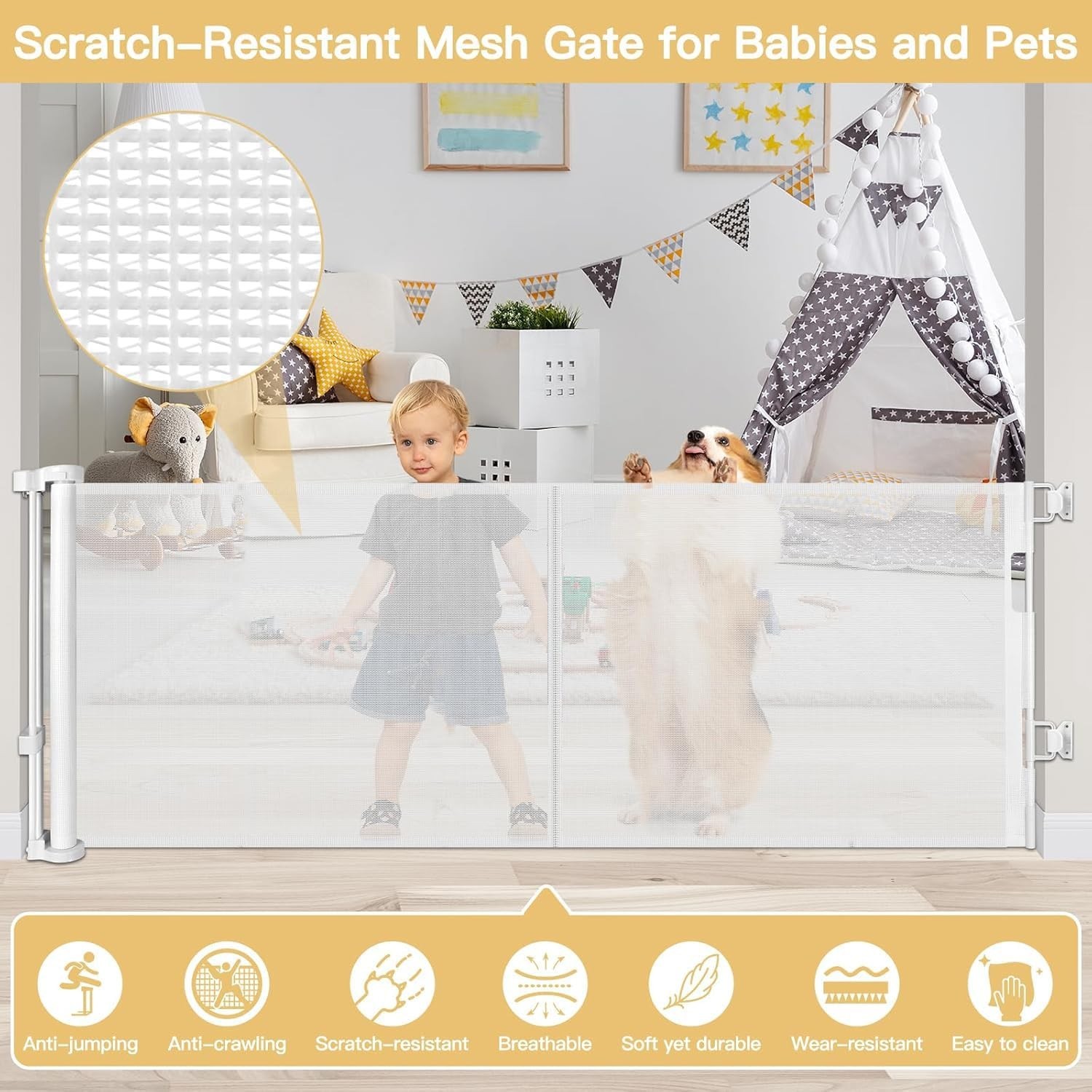 как выглядит Reinforced 28 Inch Tall Retractable Baby Gates for Dogs, Easy Step Over Pet Gate фото
