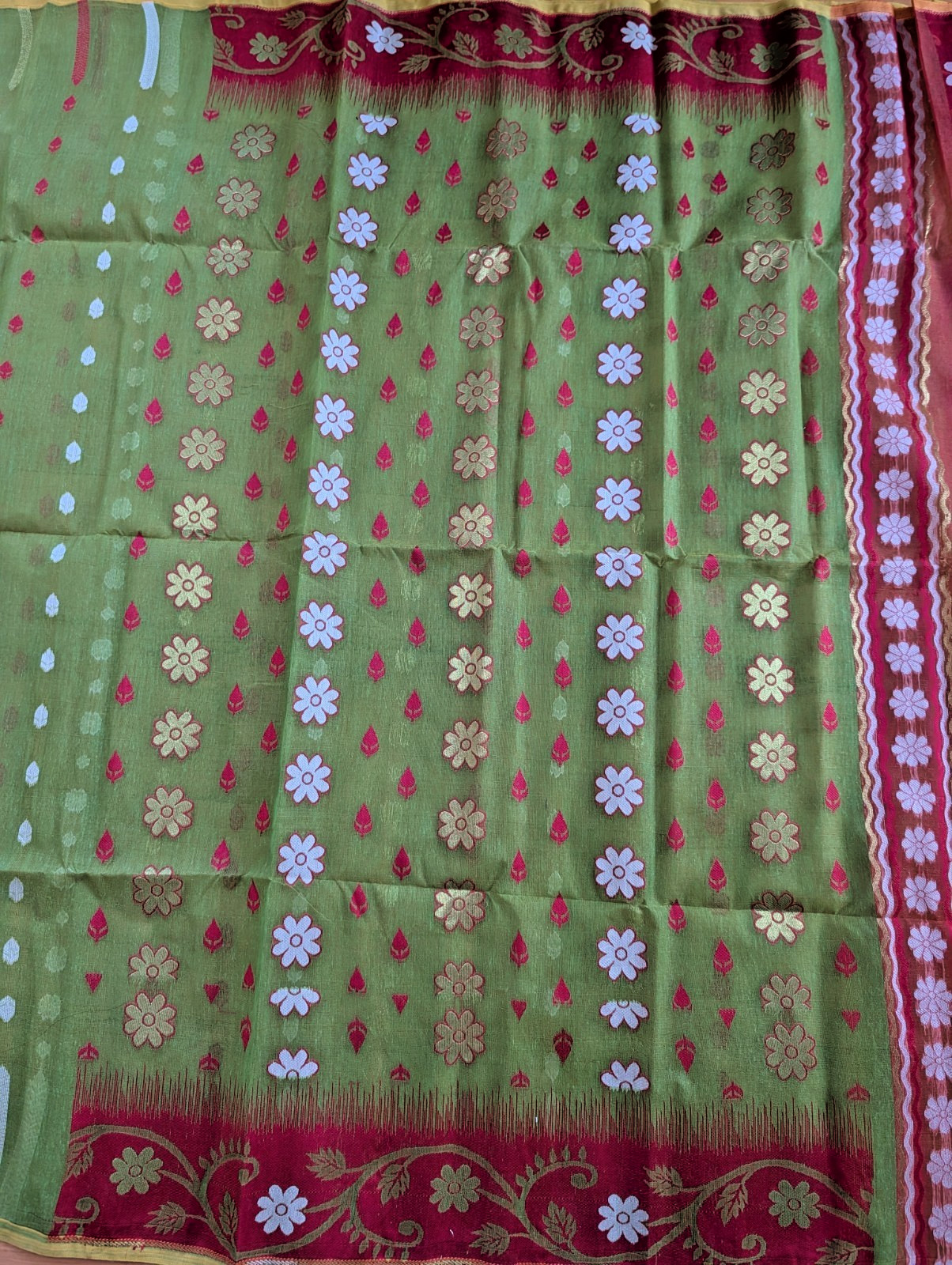 Dhakai Jamdani Handloom Saree Green Red Thread Zari Weaving Cotton Comfortable