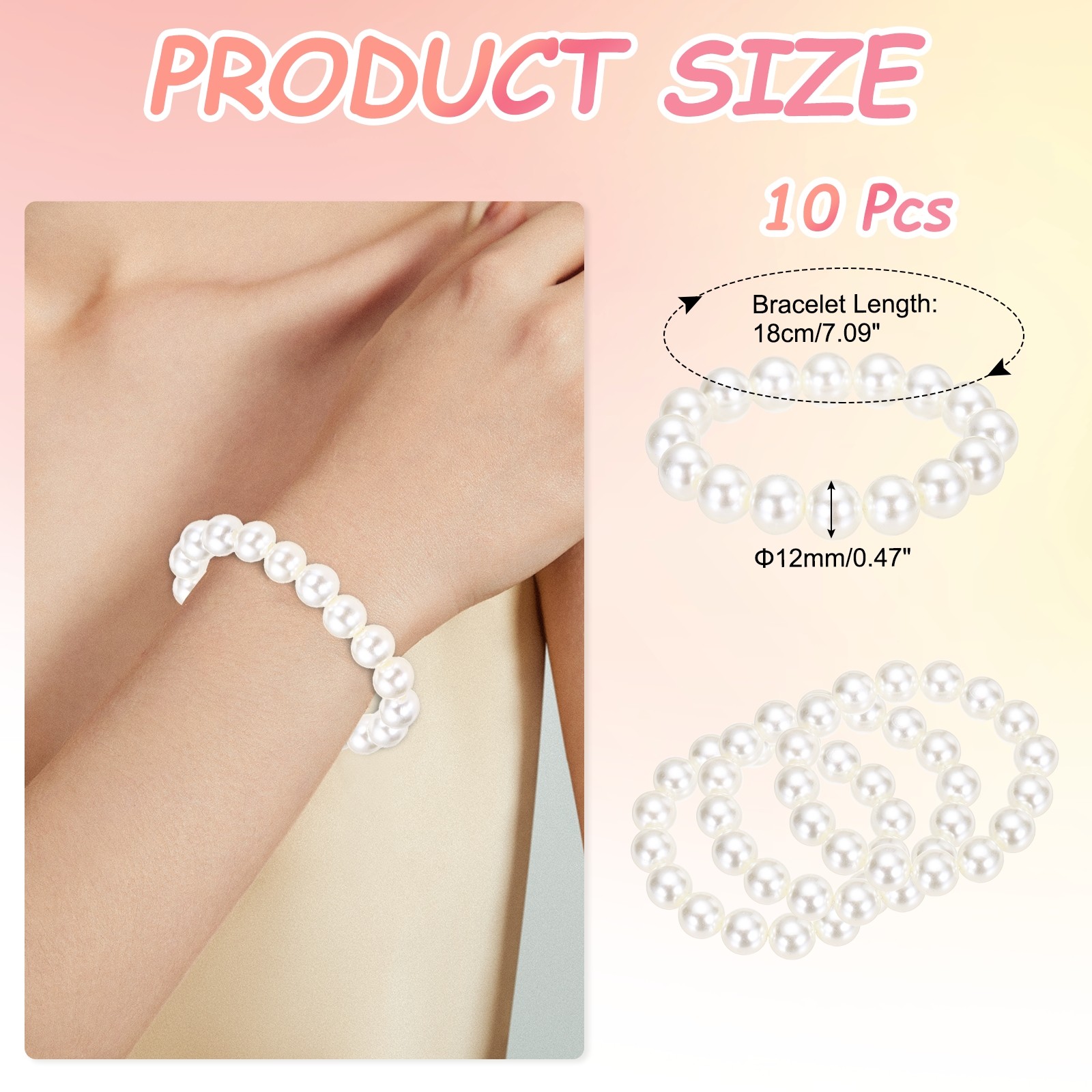 10 Pcs White Pearl Bracelets for Women, 12mm Pearl Stretch Bracelet, Beige