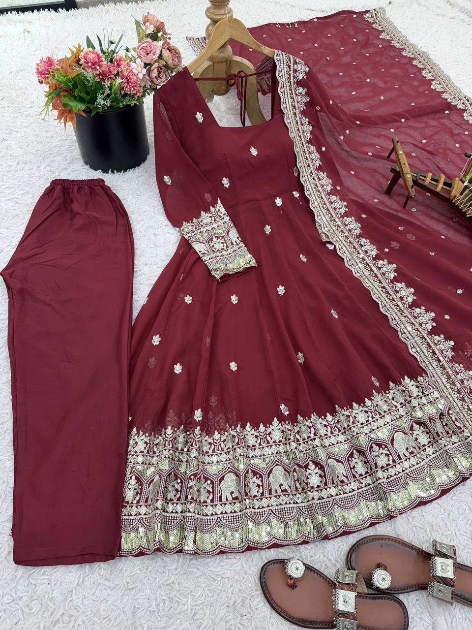 как выглядит New Maroon Heavy Georgette Gown Bottom And Dupatta For Festival Party Wear фото