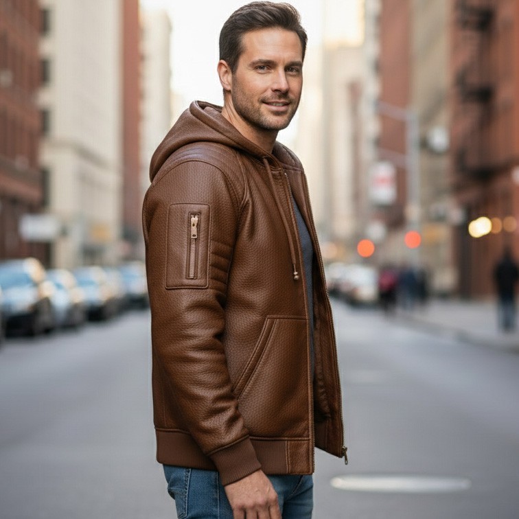 Men's Brown Premium Leather Hoodie Handmade Genuine Lambskin Leather Jacket Coat