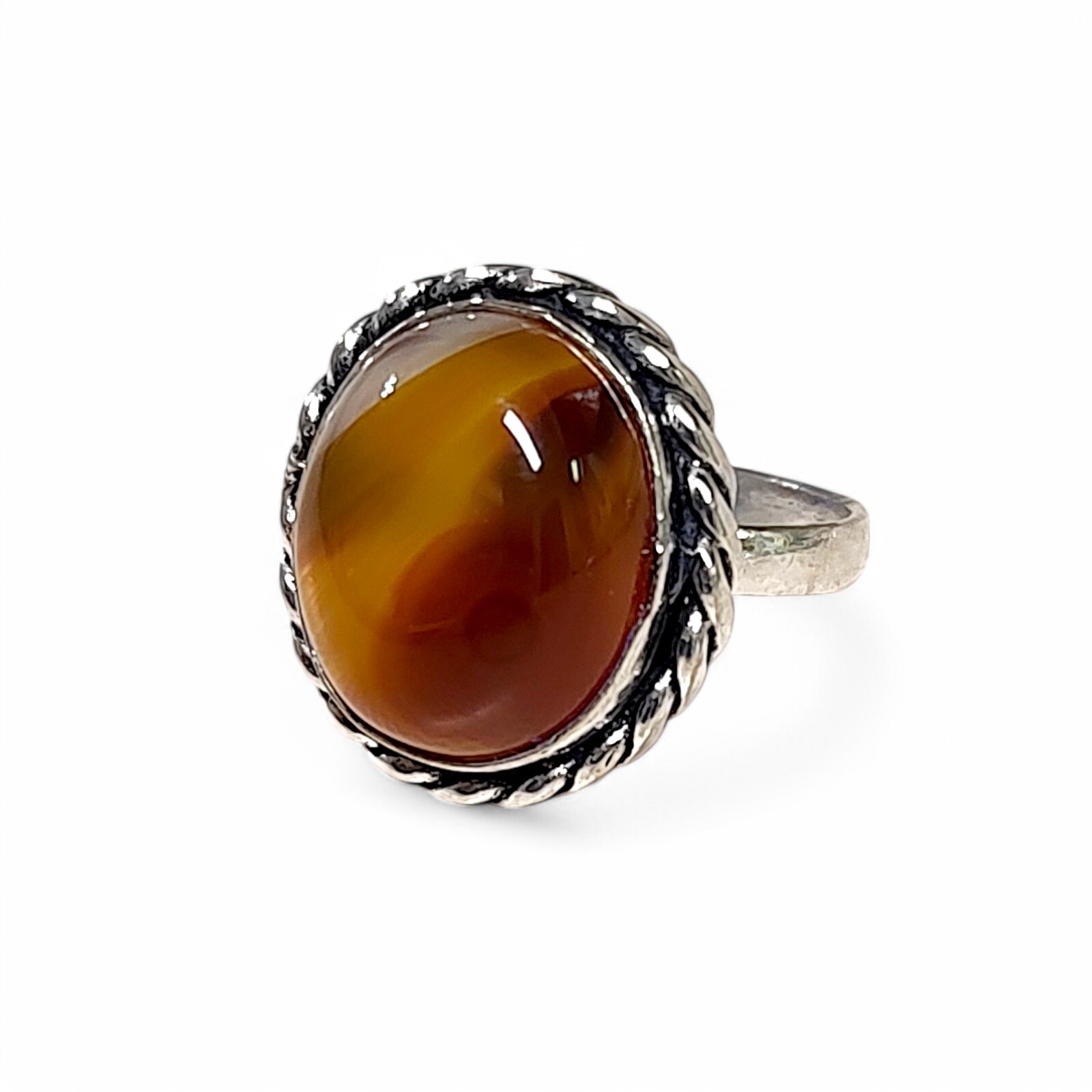 Lady's Silver Tone Orange Banded Agate Ring Size 8.5 Ornate Handcrafted