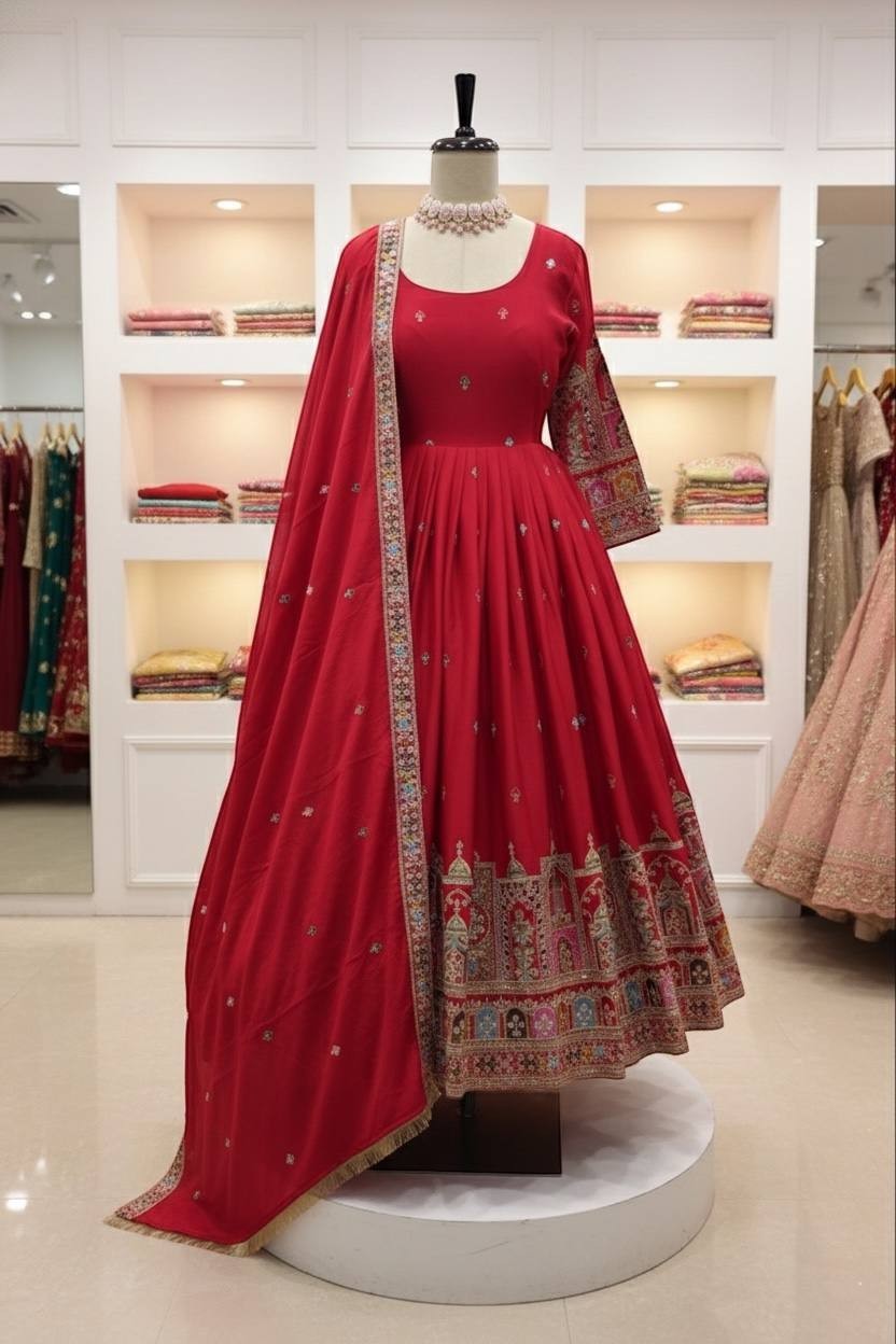 как выглядит Exclusive Look Chinon Silk Red Gown Bottom With Dupatta For Festival Wear фото
