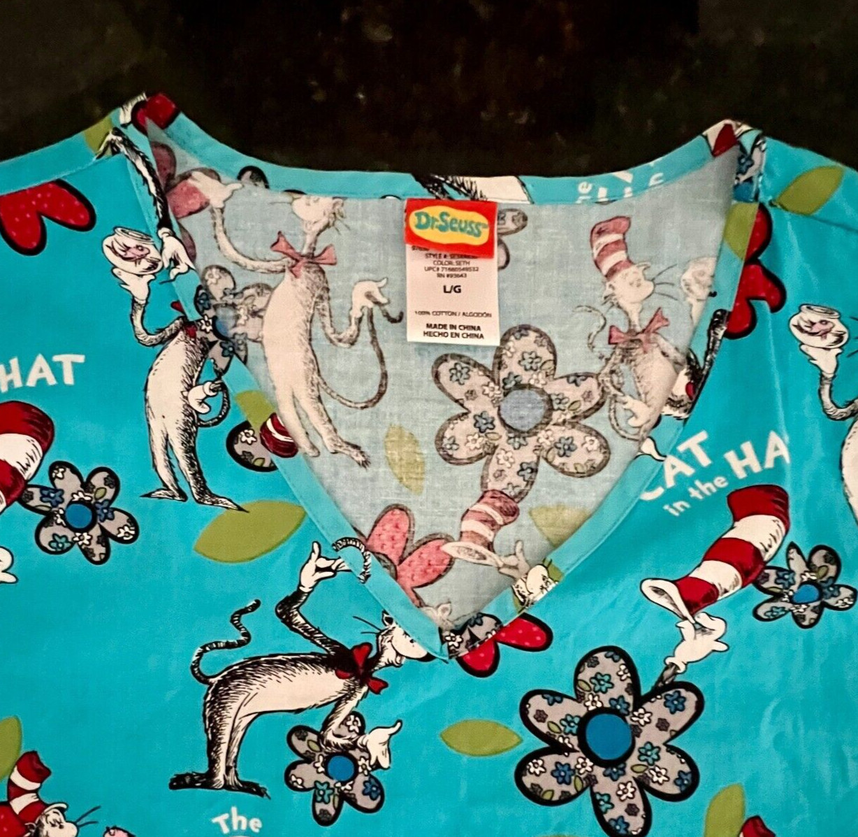как выглядит Dr Seuss Large V Neck Blue/Red Cat in the Hat Floral Scrubs Top фото