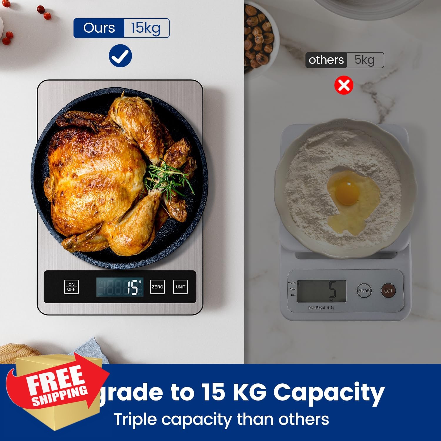 Digital Kitchen Scale 33lb USB Rechargeable Stainless Steel