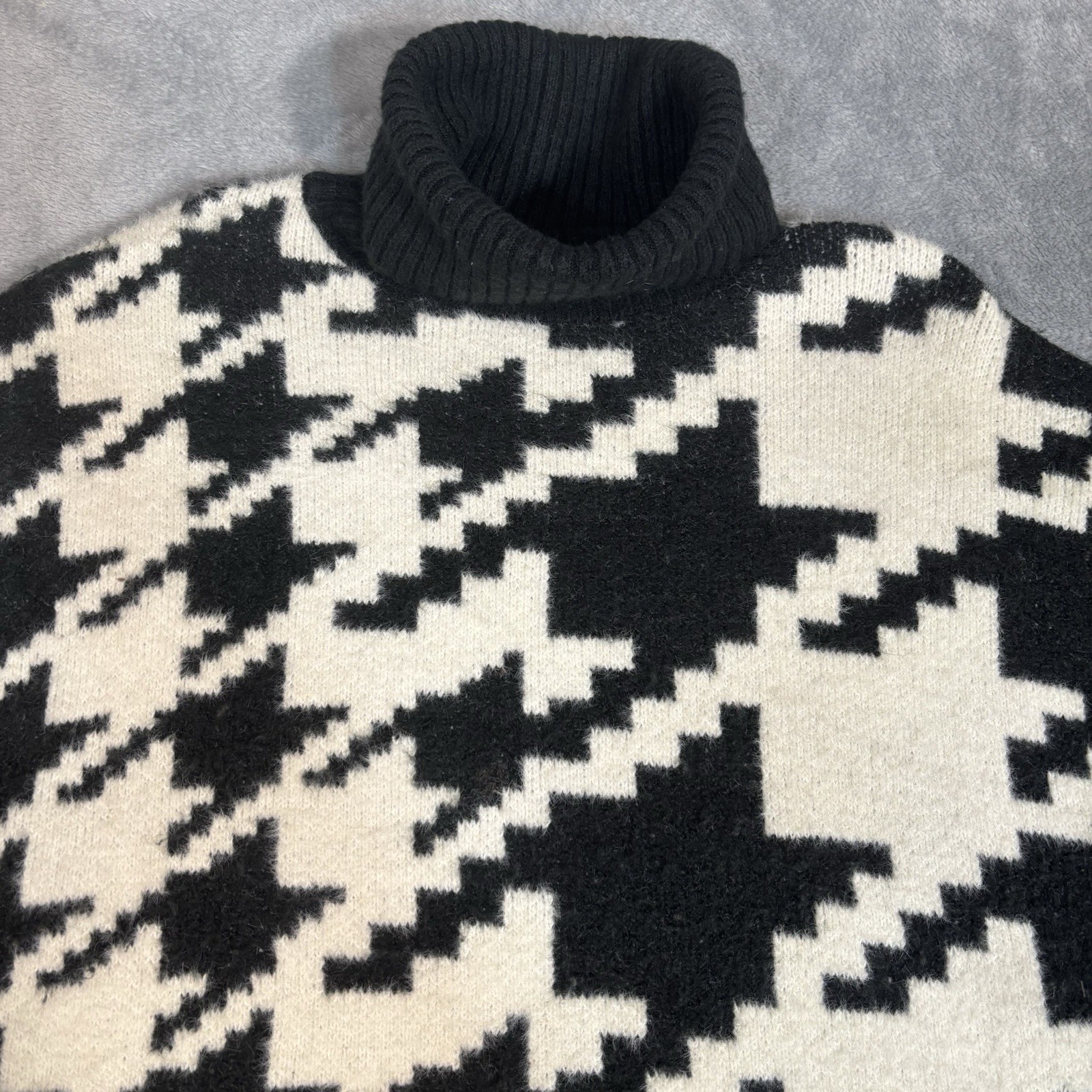 как выглядит H M Womens Turtleneck Houndstooth Sweater Black White Large Wool Jacquard фото