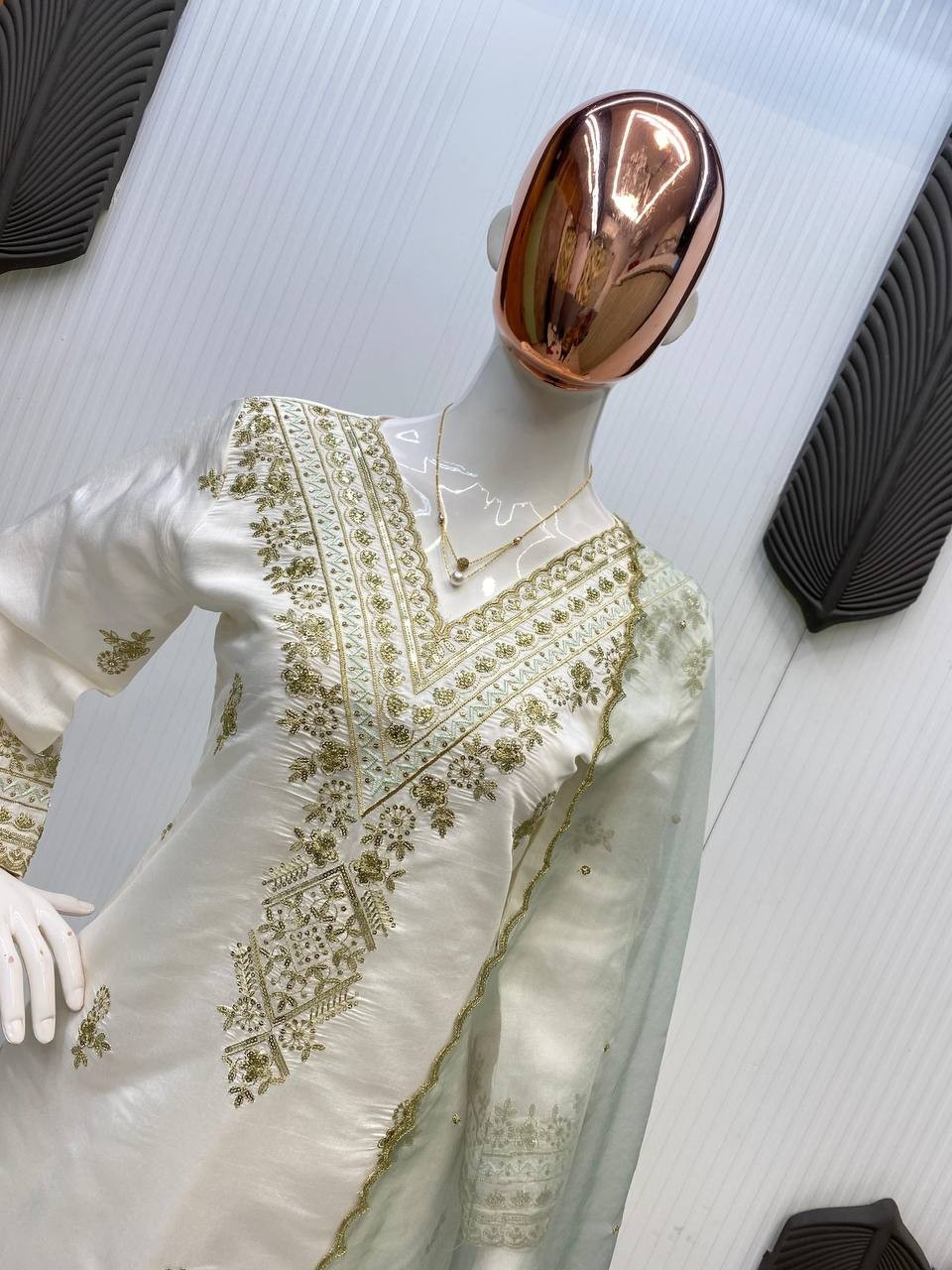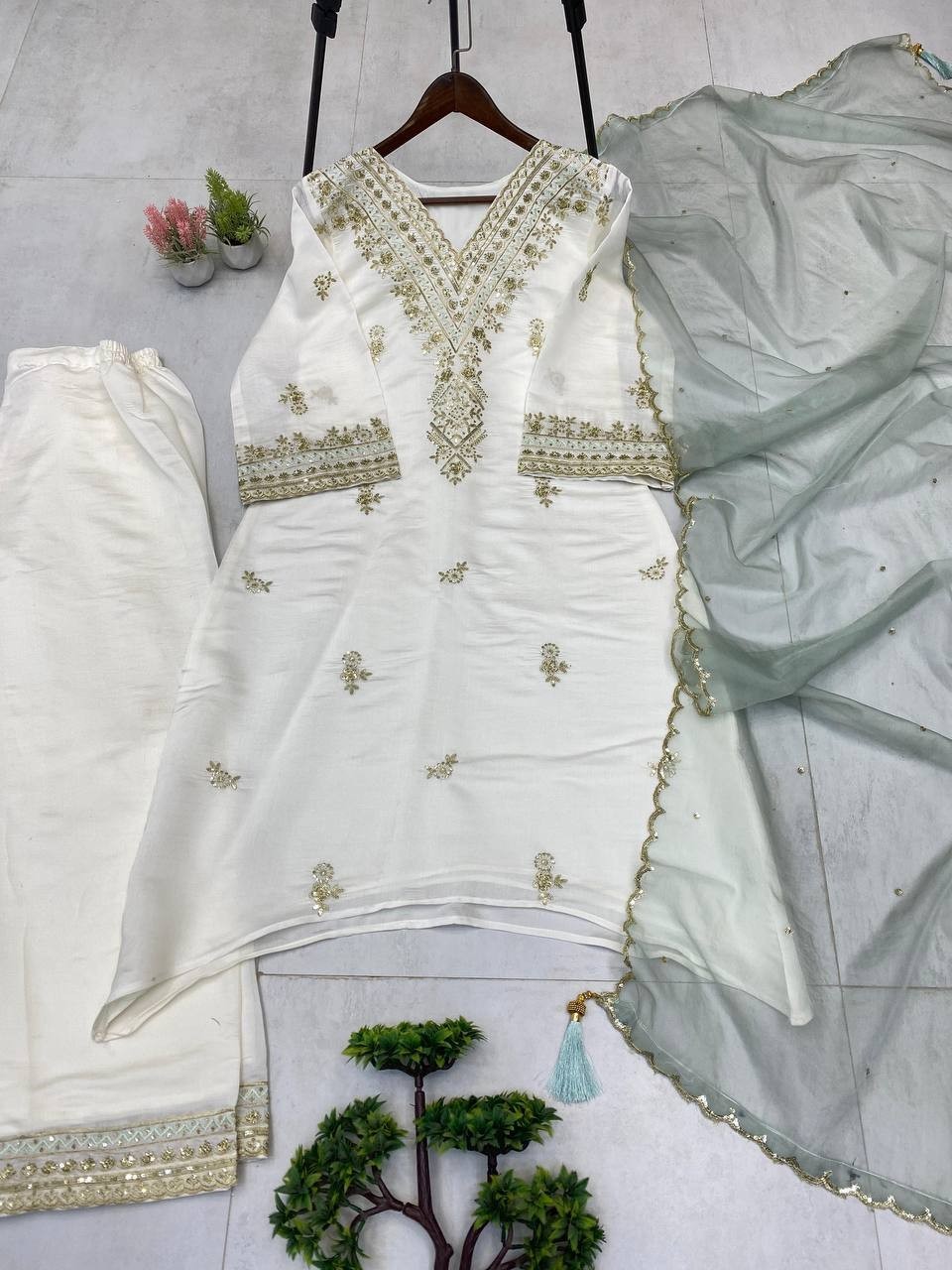 как выглядит New Launching Roman Silk White Top Palazzo With Dupatta For Festival Wear фото