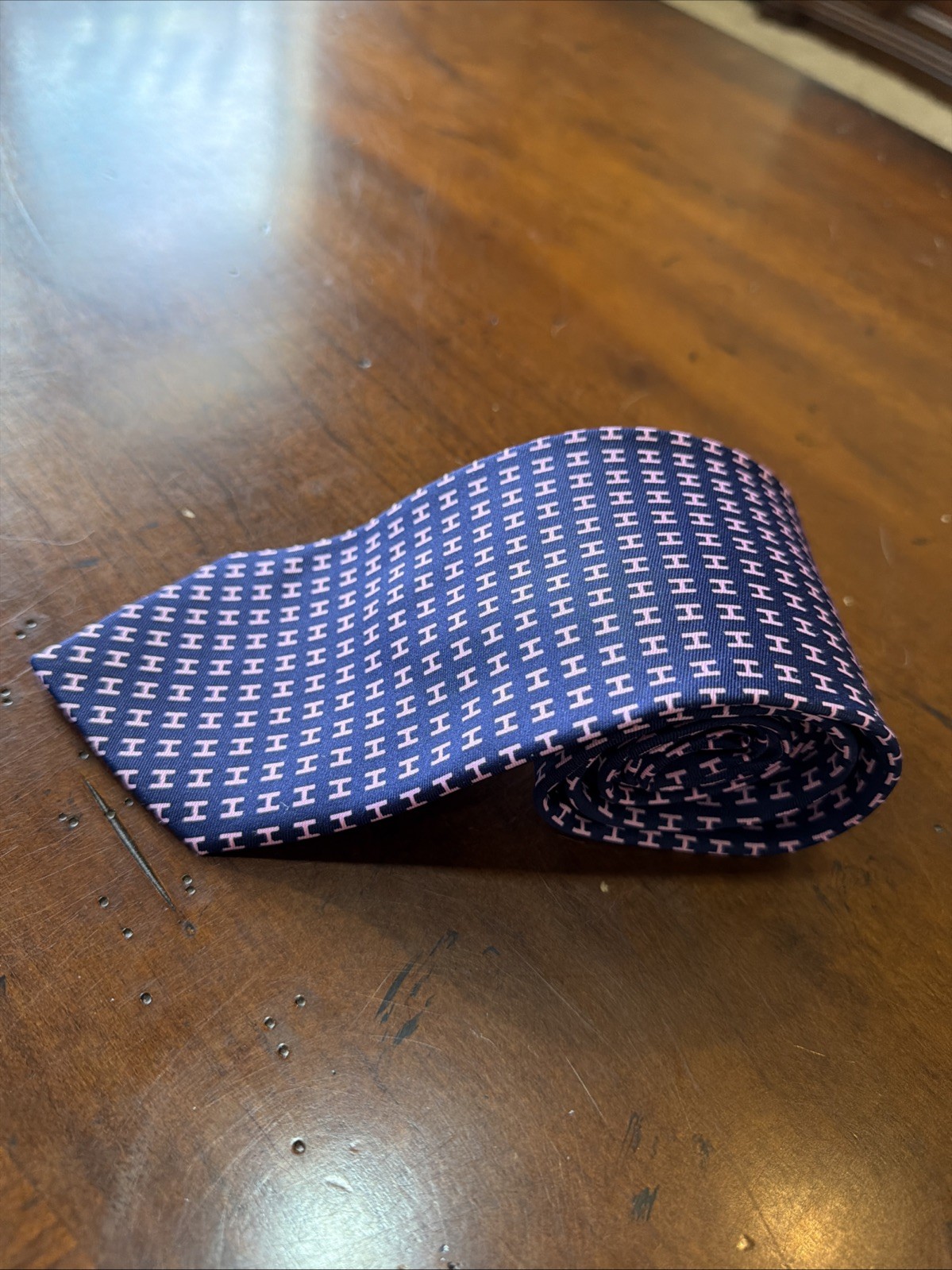 Herm s Paris Silk tie -Purple Tie With Pink H Design- Made in France