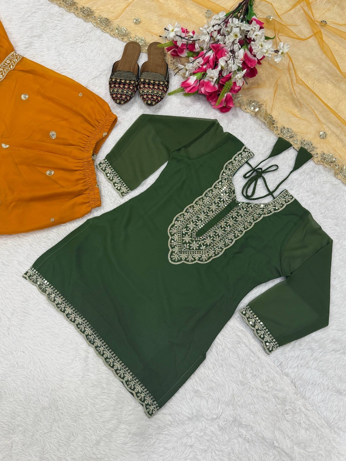 как выглядит Latest Heavy Faux Georgette Green Top Palazzo With Dupatta For Festival Wear фото