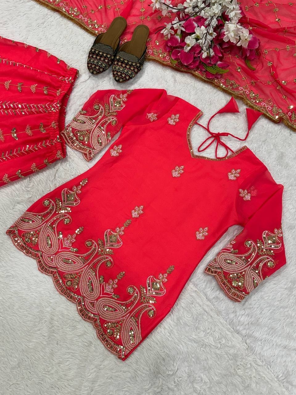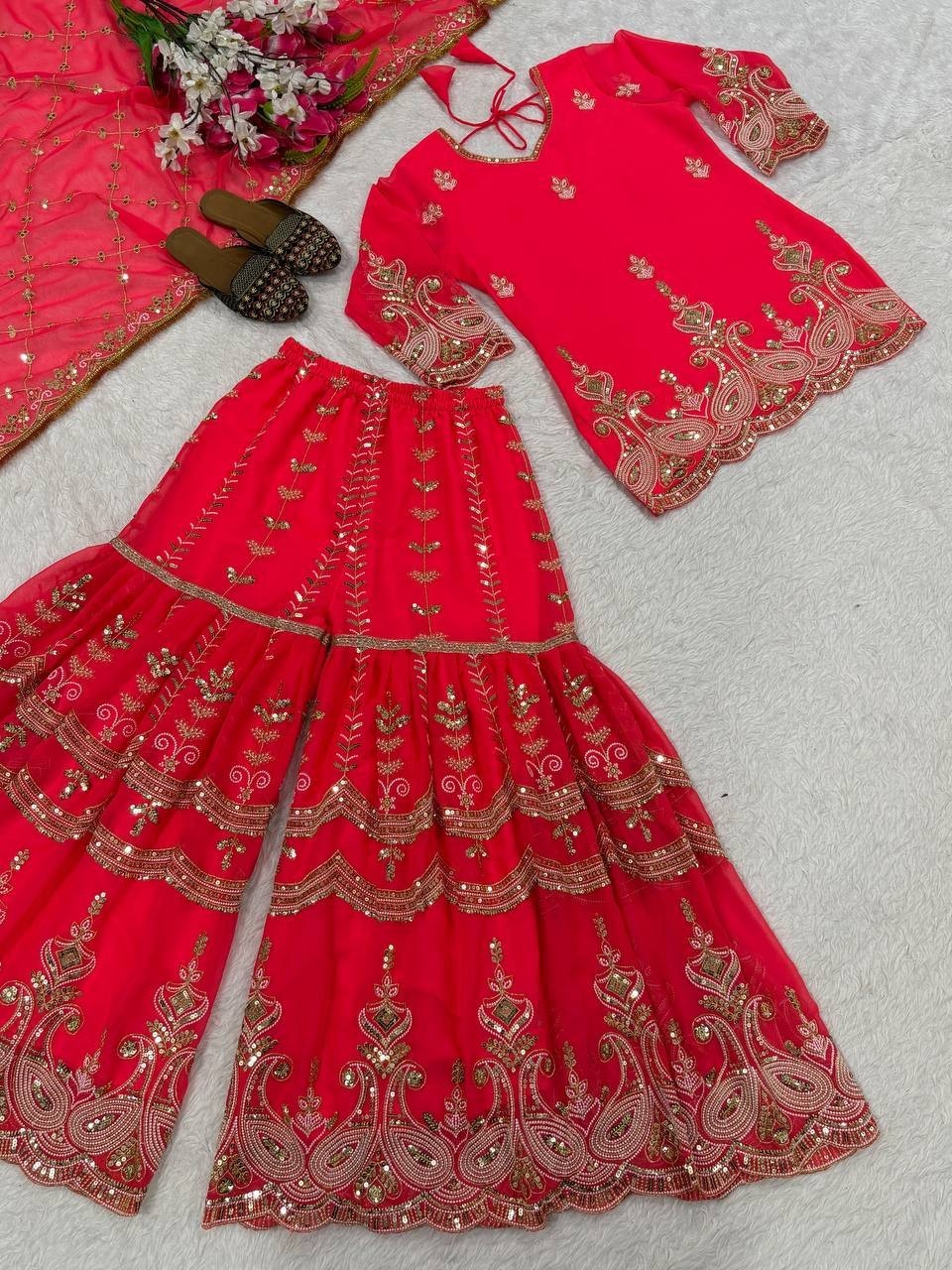 Exclusive Heavy Faux Georgette Pink Top Palazzo With Dupatta For Women Girls