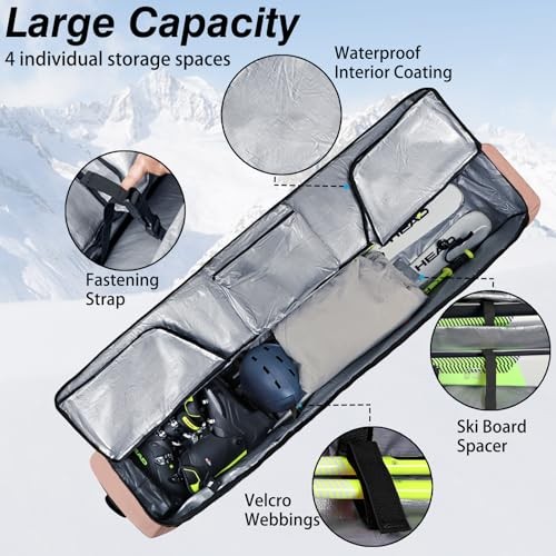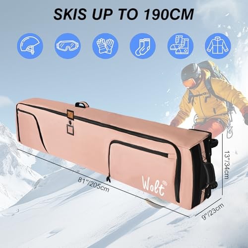 Rolling Ski Bag,Padded Snowboard Bag with Wheels for Air Travel, 190 Lightpink