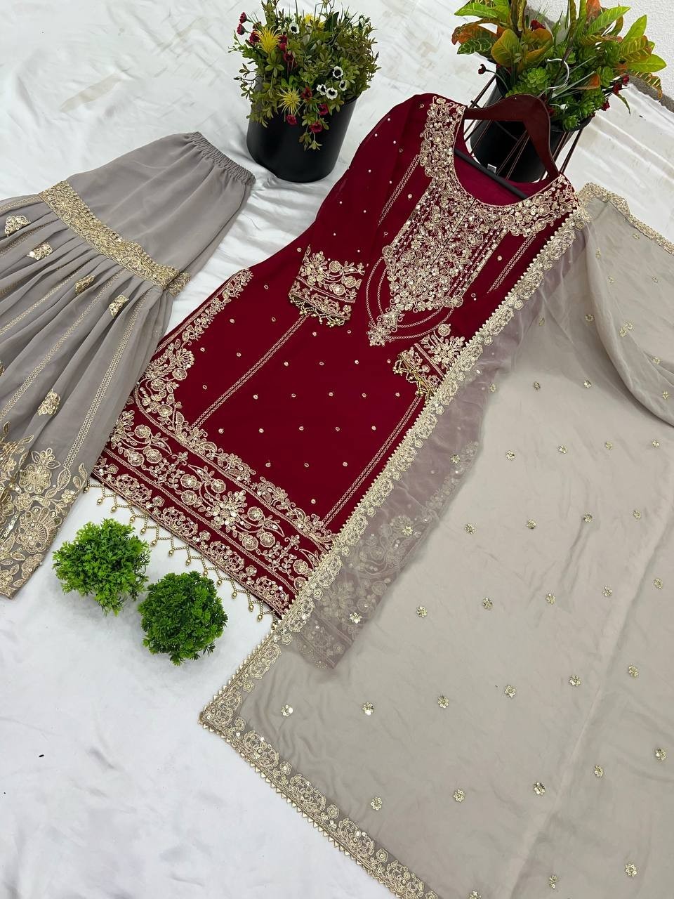 как выглядит Exclusive Heavy Faux Georgette Maroon Top Palazzo With Dupatta For Festival Wear фото