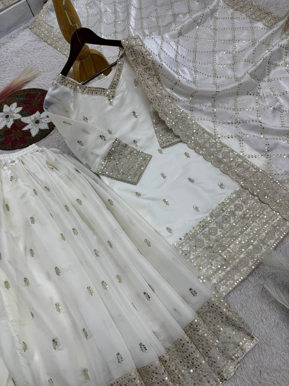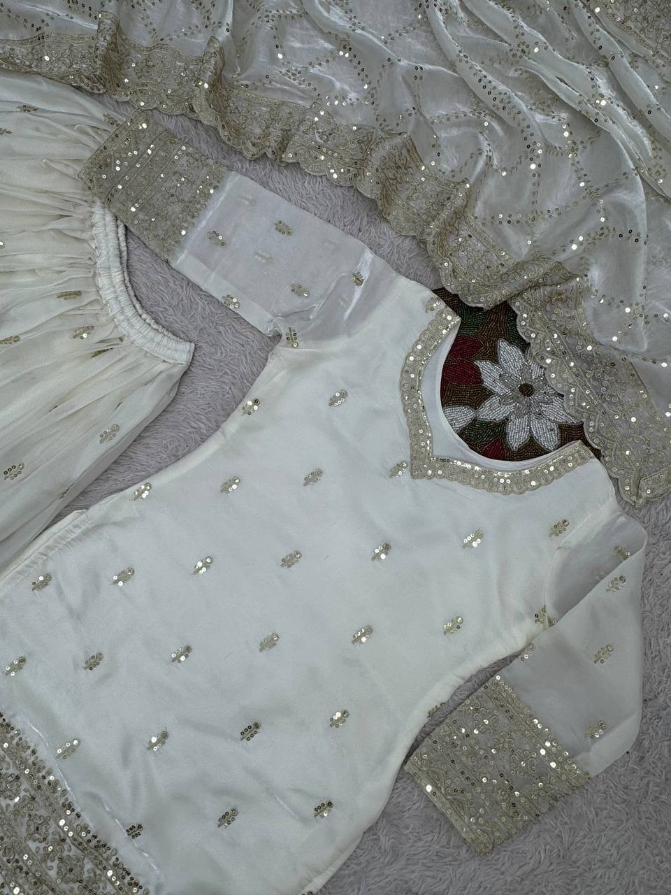как выглядит Bollywood Look Pure Silk White Top Palazzo With Dupatta For Function Wear фото