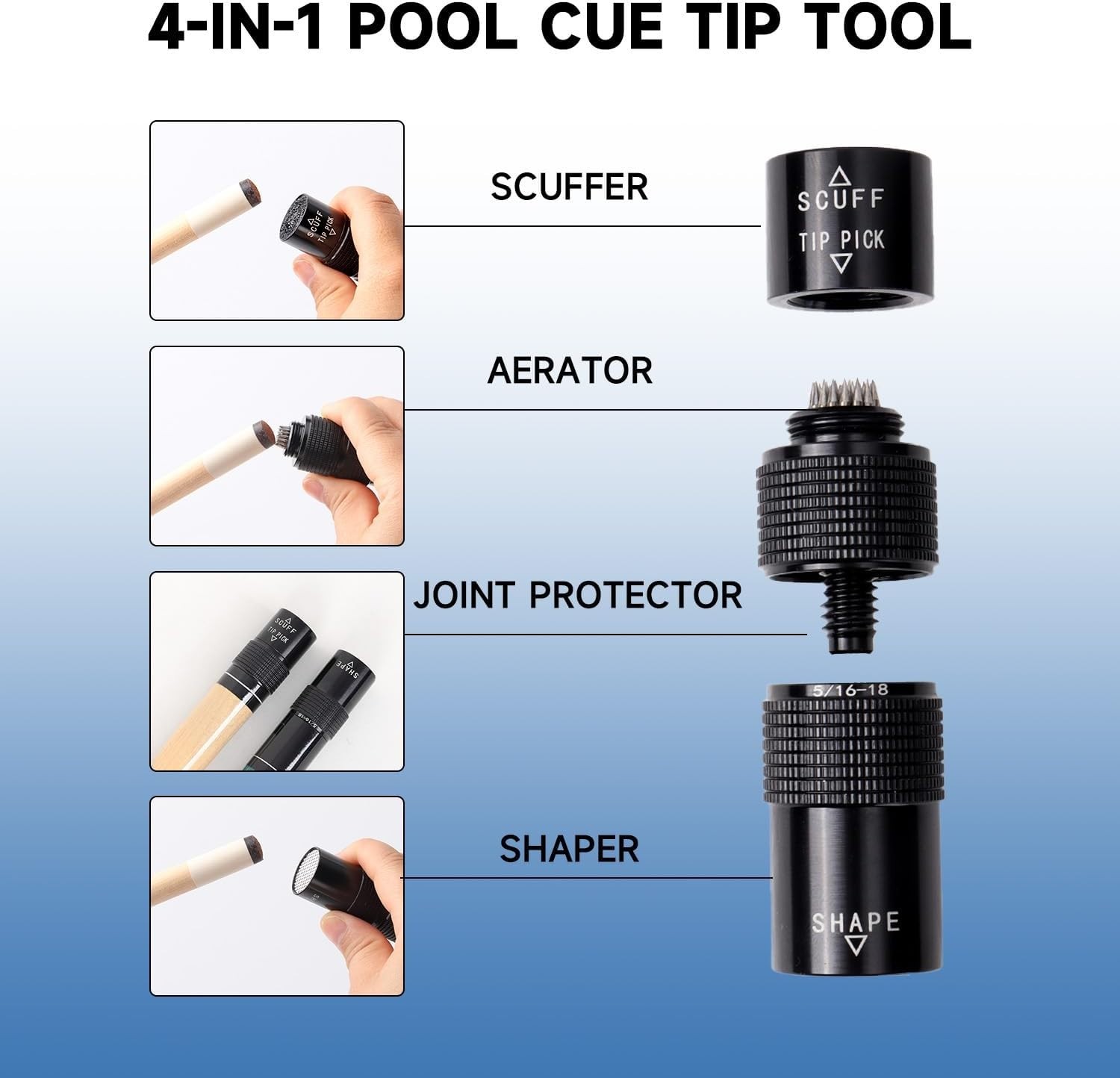 Multi-Function Aluminum Billiard Cue Tip Tool with Joint Protector - 3-in-1