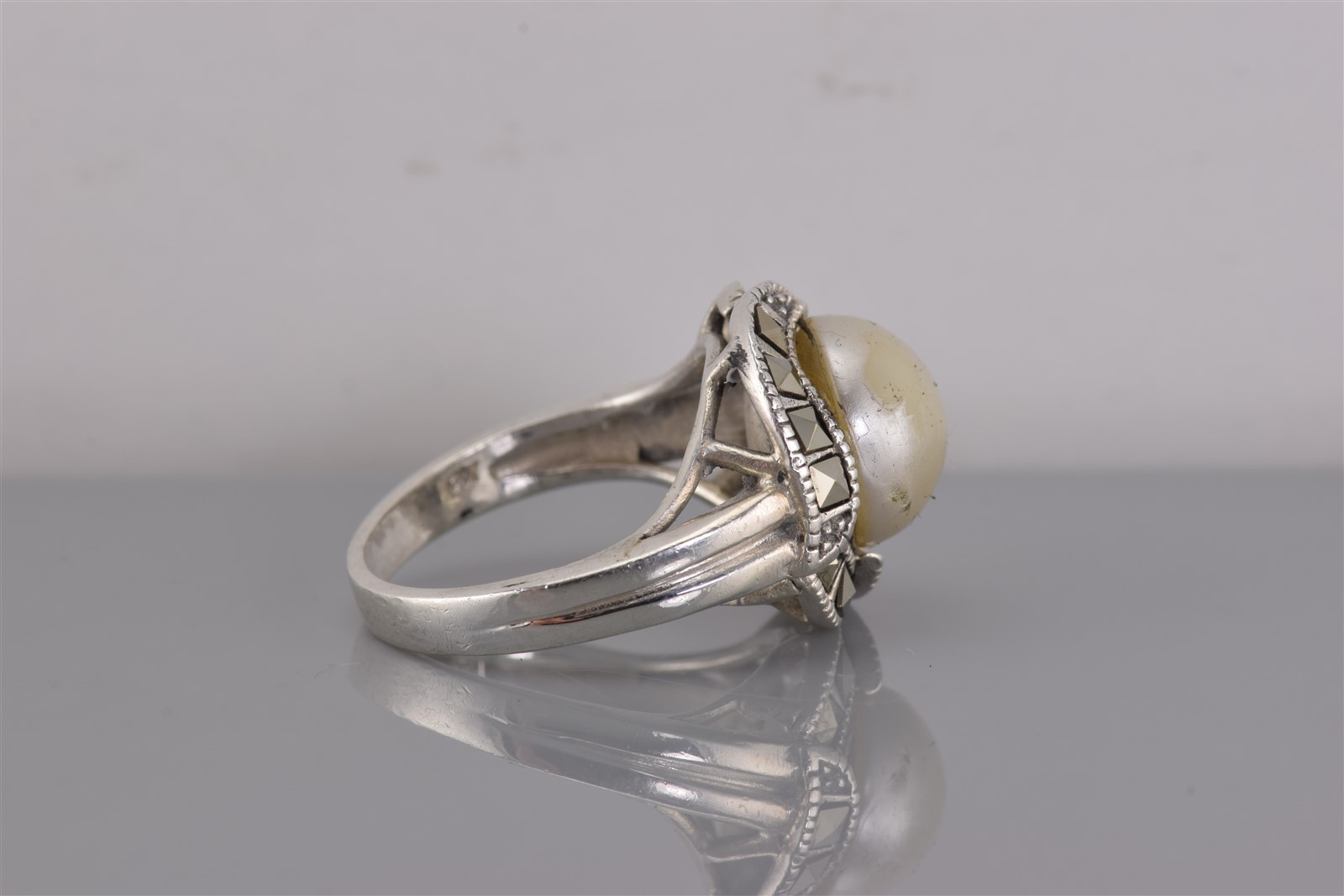 как выглядит Sterling Silver White Pearl Swirled Marcasite Bezel Band Ring 925 Sz: 7 фото
