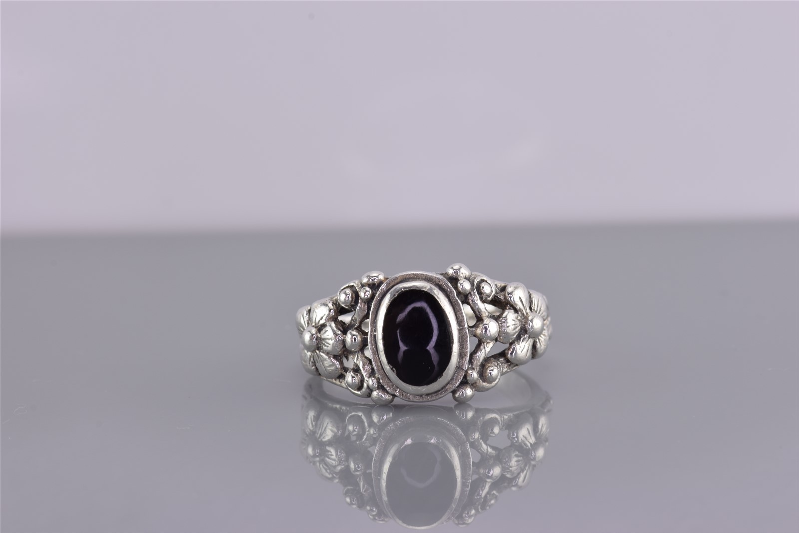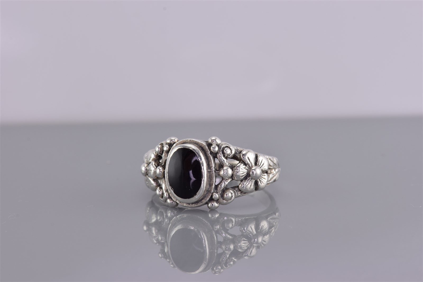 как выглядит Sterling Silver Black Oval Onyx Raised Flowers Accented Band Ring 925 Sz: 6 фото