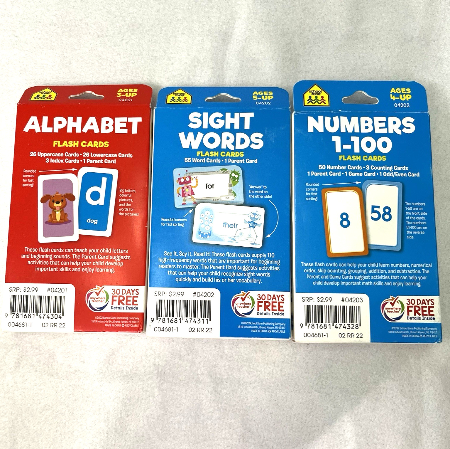 School Zone Flashcards - Alphabet - Sight Words - Numbers 1-100