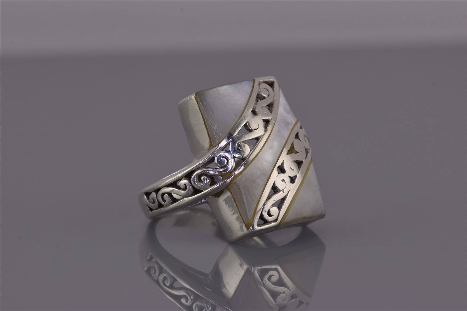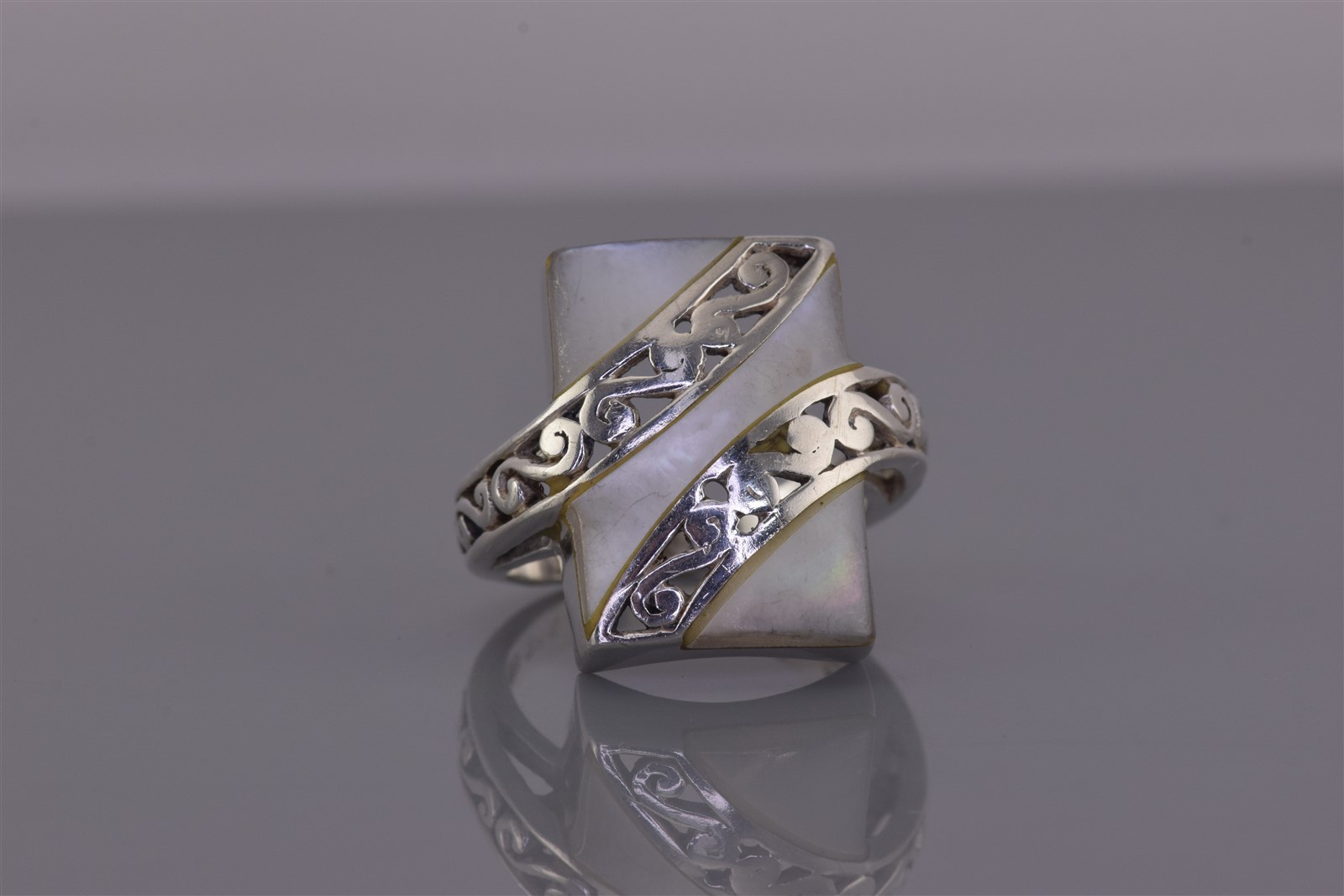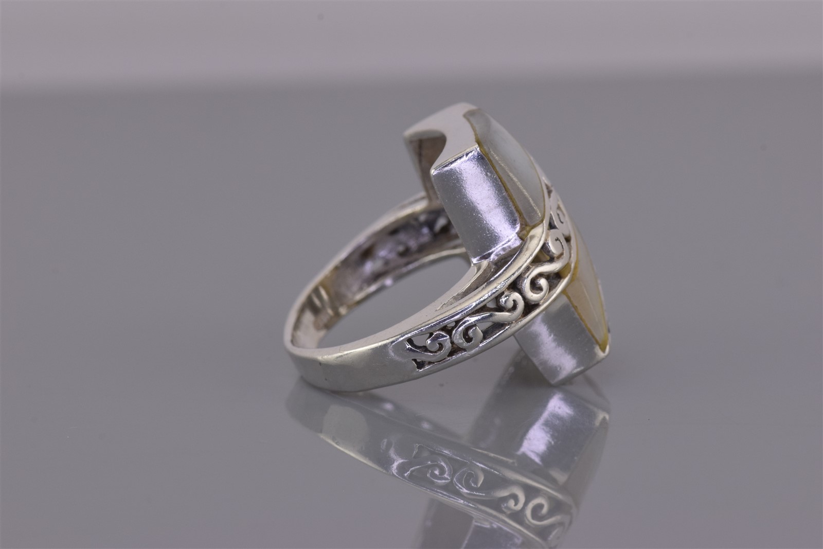 как выглядит Sterling Silver 20mm Mother of Pearl Scrolled Crossover Band Ring 925 Sz: 7 фото